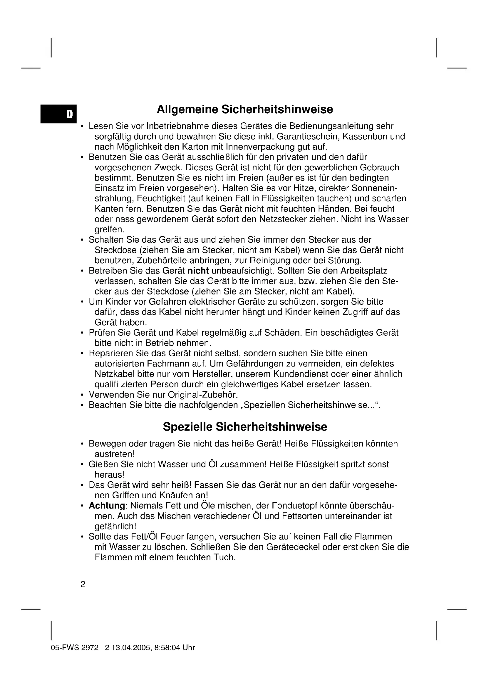 - Sollte das Fett/Öl Feuer fangen, versuchen Sie auf keinen Fall die Flammen mit Wasser zu löschen. Schließen Sie den Gerätedeckel oder ersticken Sie die Flammen mit einem feuchten Tuch. 05-FWS 2972 2 13.04.2005, 8:58:04 UhrD