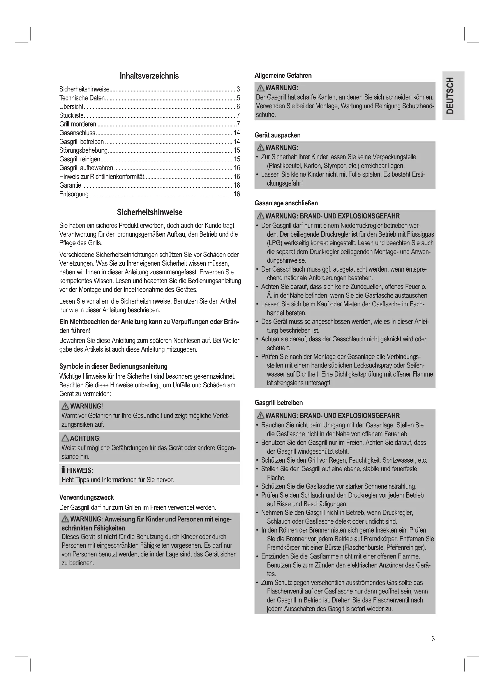 - Entsorgung Sicherheitshinweise Sie haben ein sicheres Produkt erworben, doch auch der Kunde trägt Verantwortung für den ordnungsgemäßen Aufbau, den Betrieb und die Pege des Grills. Verschiedene Sicherheitseinrichtungen schützen Sie vor Schäden oder Verletzungen. Was Sie zu Ihrer eigenen Sicherheit wissen müssen, haben wir Ihnen in dieser Anleitung zusammengefasst. Erwerben Sie kompetentes Wissen. Lesen und beachten Sie die Bedienungsanleitung vor der Montage und der Inbetriebnahme des Gerätes. Lesen Sie vor allem die Sicherheitshinweise. Benutzen Sie den Artikel nur wie in dieser Anleitung beschrieben. Ein Nichtbeachten der Anleitung kann zu Verpuffungen oder Brän- den führen! Bewahren Sie diese Anleitung zum späteren Nachlesen auf. Bei Weiter- gabe des Artikels ist auch diese Anleitung mitzugeben. Symbole in dieser Bedienungsanleitung Wichtige Hinweise für Ihre Sicherheit sind besonders gekennzeichnet. Beachten Sie diese Hinweise unbedingt, um Unfälle und Schäden am Gerät zu vermeiden: WARNUNG! Warnt vor Gefahren für Ihre Gesundheit und zeigt mögliche Verlet- zungsrisiken auf. ACHTUNG: Weist auf mögliche Gefährdungen für das Gerät oder andere Gegen- stände hin. HINWEIS: Hebt Tipps und Informationen für Sie hervor. Verwendungszweck Der Gasgrill darf nur zum Grillen im Freien verwendet werden. WARNUNG: Anweisung für Kinder und Personen mit einge- schränkten Fähigkeiten Dieses Gerät ist nicht für die Benutzung durch Kinder oder durch Personen mit eingeschränkten Fähigkeiten vorgesehen. Es darf nur von Personen benutzt werden, die in der Lage sind, das Gerät sicher zu bedienen. Allgemeine Gefahren WARNUNG: Der Gasgrill hat scharfe Kanten, an denen Sie sich schneiden können. Verwenden Sie bei der Montage, Wartung und Reinigung Schutzhand- schuhe. Gerät auspacken WARNUNG: p. 16