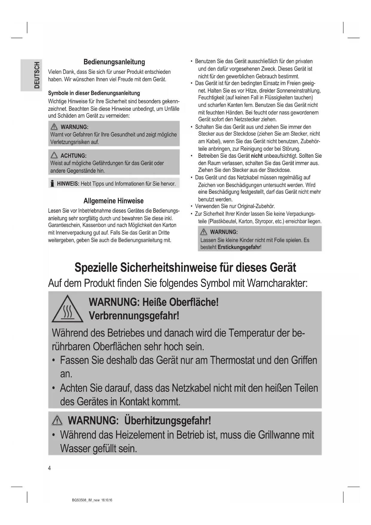 - Während das Heizelement in Betrieb ist, muss die Grillwanne mit Wasser gefüllt sein.5 BQS3508_IM_new 18.10.16 WARNUNG: Überhitzungsgefahr!