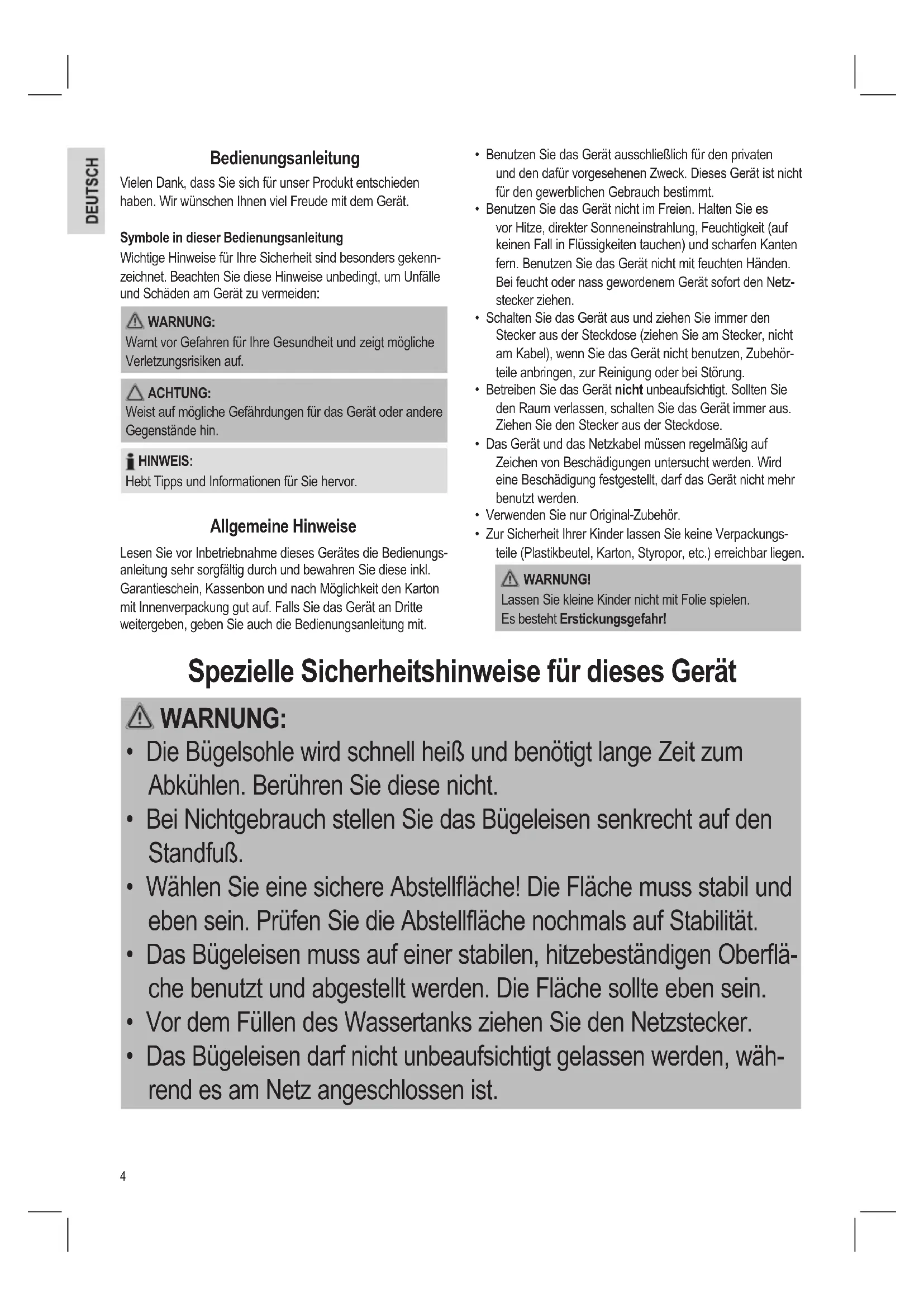 - Das Bügeleisen darf nicht unbeaufsichtigt gelassen werden, wäh- rend es am Netz angeschlossen ist.5 WARNUNG: