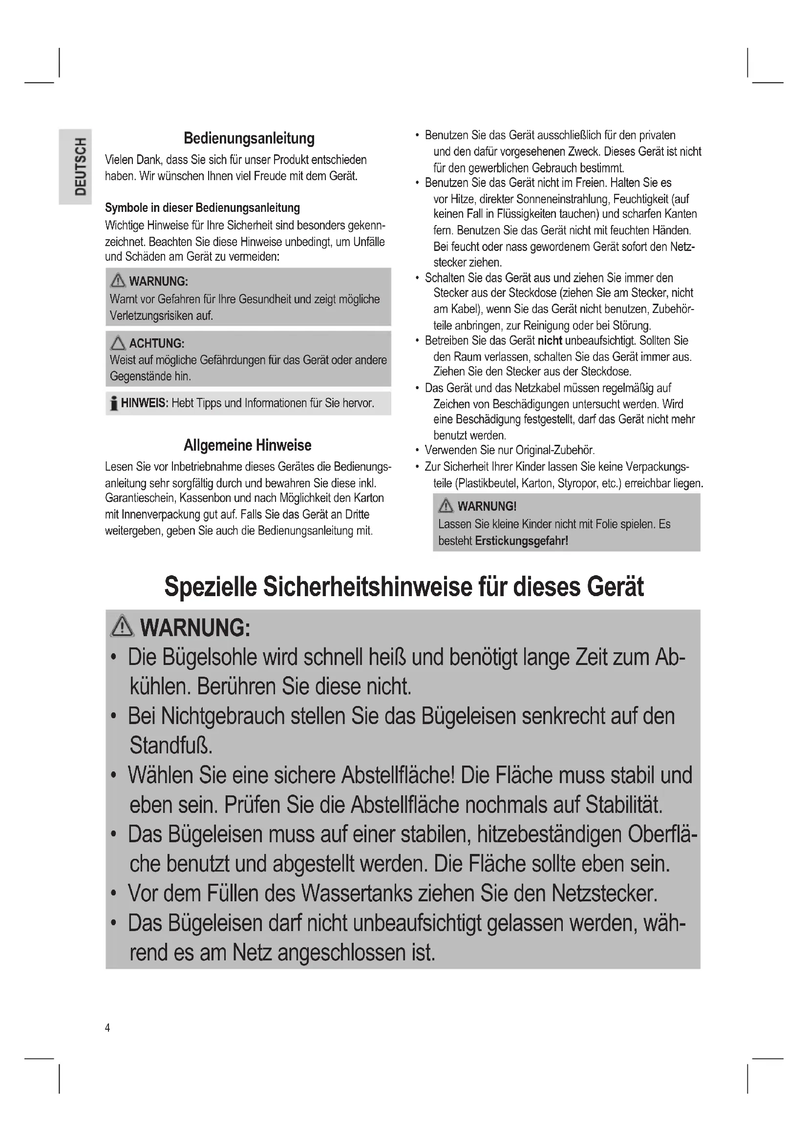 - Das Bügeleisen darf nicht unbeaufsichtigt gelassen werden, wäh- rend es am Netz angeschlossen ist.5 WARNUNG: