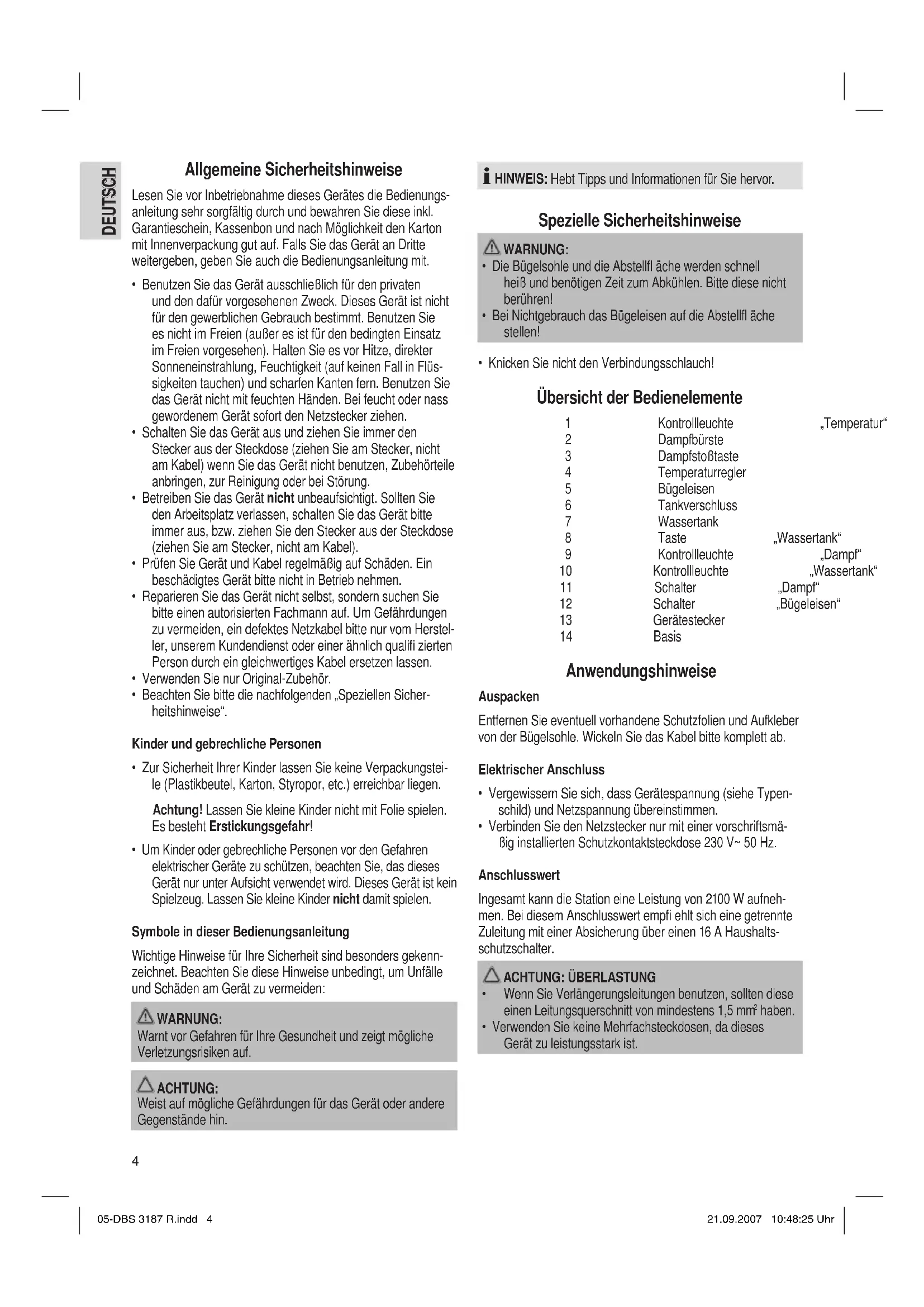 Обзор деталей прибора .............................................. стр. 3 Руководство по эксплуатации .................................... стр. 47 Технические данные ................................................... стр. 50 Гарантия ....................................................................... стр. 50 05-DBS 3187 R.indd 205-DBS 3187 R.indd 2 21.09.2007 10:48:23 Uhr21.09.2007 10:48:23 Uhr3 Übersicht der Bedienelemente Overzicht van de bedieningselementen • Liste des différents éléments de commande Indicación de los elementos de manejo • Descrição dos elementos • Elementi di comando Oversikt over betjeningselementene • Overview of the Components Przegląd elementów obsługi • Přehled ovládacích prvků • A kezelőelemek áttekintése Обзор деталей прибора 05-DBS 3187 R.indd 305-DBS 3187 R.indd 3 21.09.2007 10:48:24 Uhr21.09.2007 10:48:24 Uhr4 DEUTSCH DEUTSCH Allgemeine Sicherheitshinweise Lesen Sie vor Inbetriebnahme dieses Gerätes die Bedienungs- anleitung sehr sorgfältig durch und bewahren Sie diese inkl. Garantieschein, Kassenbon und nach Möglichkeit den Karton mit Innenverpackung gut auf. Falls Sie das Gerät an Dritte weitergeben, geben Sie auch die Bedienungsanleitung mit.