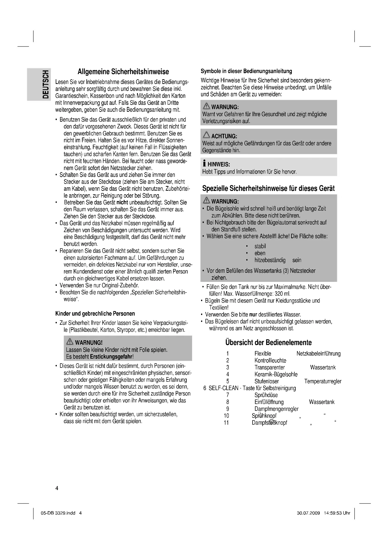 - Das Bügeleisen darf nicht unbeaufsichtigt gelassen werden, während es am Netz angeschlossen ist. Übersicht der Bedienelemente 1 Flexible Netzkabeleinführung 2 Kontrollleuchte 3 Transparenter Wassertank 4 Keramik-Bügelsohle 5 Stufenloser Temperaturregler 6 SELF-CLEAN - Taste für Selbstreinigung 7 Sprühdüse 8 Einfüllöffnung Wassertank 9 Dampfmengenregler 10 Sprühknopf „ “ 11 Dampfstoßknopf „ “ 05-DB 3329.indd 405-DB 3329.indd 4 30.07.2009 14:59:53 Uhr30.07.2009 14:59:53 Uhr5 DEUTSCH DEUTSCH Anwendungshinweise Auspacken