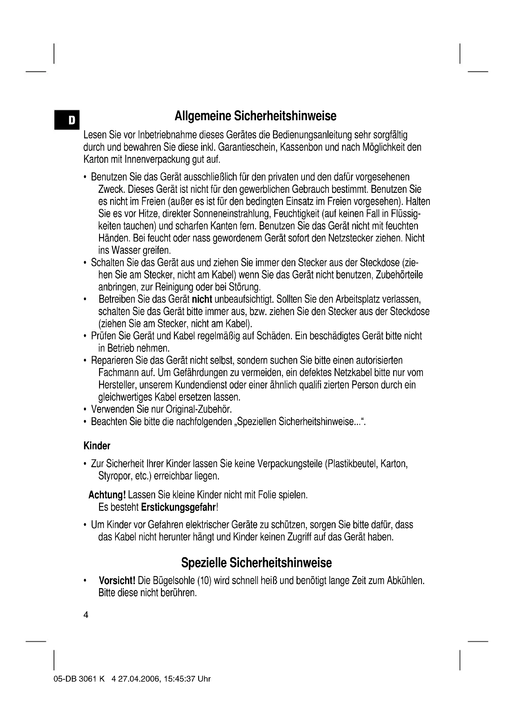 - Vorsicht! Die Bügelsohle (10) wird schnell heiß und benötigt lange Zeit zum Abkühlen. Bitte diese nicht berühren. 05-DB 3061 K 4 27.04.2006, 15:45:37 UhrD