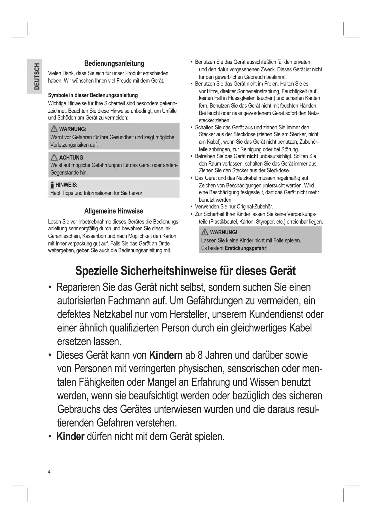 - Zur Sicherheit Ihrer Kinder lassen Sie keine Verpackungs- teile (Plastikbeutel, Karton, Styropor, etc.) erreichbar liegen. WARNUNG! Lassen Sie kleine Kinder nicht mit Folie spielen. Es besteht Erstickungsgefahr! Bedienungsanleitung Vielen Dank, dass Sie sich für unser Produkt entschieden haben. Wir wünschen Ihnen viel Freude mit dem Gerät. Symbole in dieser Bedienungsanleitung Wichtige Hinweise für Ihre Sicherheit sind besonders gekenn- zeichnet. Beachten Sie diese Hinweise unbedingt, um Unfälle und Schäden am Gerät zu vermeiden: WARNUNG: Warnt vor Gefahren für Ihre Gesundheit und zeigt mögliche Verletzungsrisiken auf. ACHTUNG: Weist auf mögliche Gefährdungen für das Gerät oder andere Gegenstände hin. HINWEIS: Hebt Tipps und Informationen für Sie hervor. Allgemeine Hinweise Lesen Sie vor Inbetriebnahme dieses Gerätes die Bedienungs- anleitung sehr sorgfältig durch und bewahren Sie diese inkl. Garantieschein, Kassenbon und nach Möglichkeit den Karton mit Innenverpackung gut auf. Falls Sie das Gerät an Dritte weitergeben, geben Sie auch die Bedienungsanleitung mit. Spezielle Sicherheitshinweise für dieses Gerät
