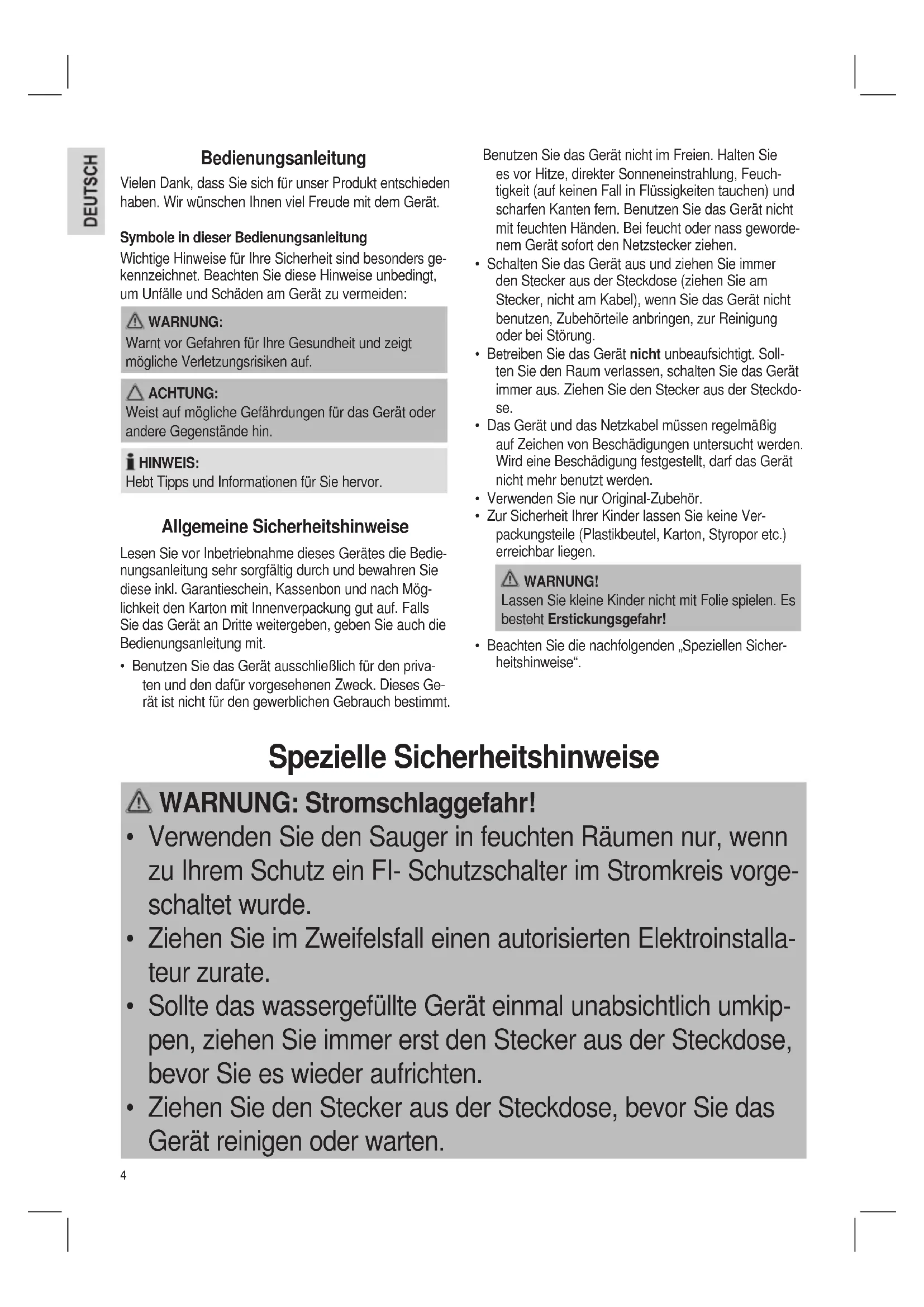 - Benutzen Sie das Gerät ausschließlich für den priva- ten und den dafür vorgesehenen Zweck. Dieses Ge- rät ist nicht für den gewerblichen Gebrauch bestimmt. Spezielle Sicherheitshinweise WARNUNG: Stromschlaggefahr!