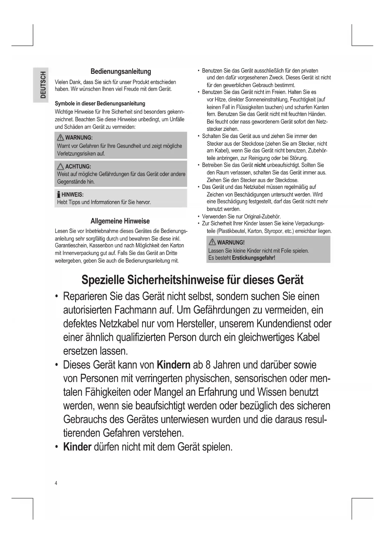 - Benutzen Sie das Gerät ausschließlich für den privaten und den dafür vorgesehenen Zweck. Dieses Gerät ist nicht für den gewerblichen Gebrauch bestimmt.