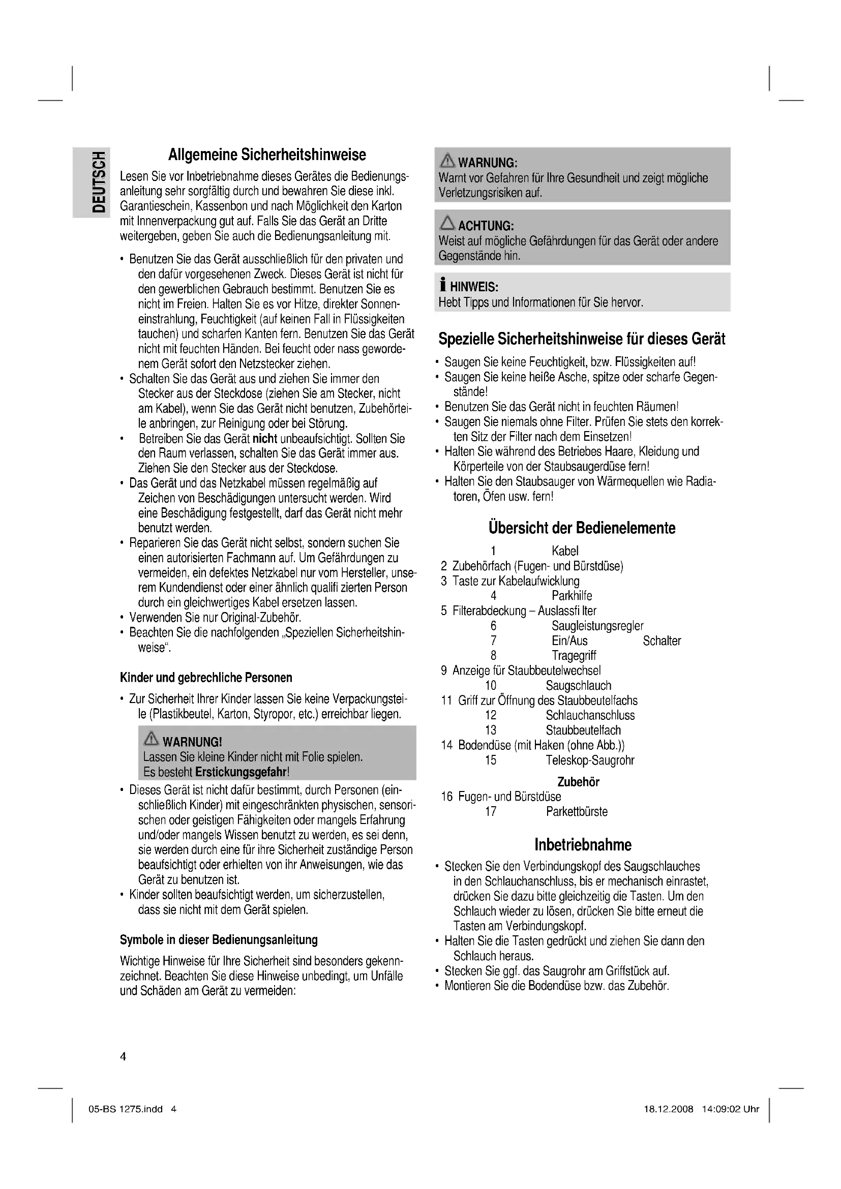 Обзор деталей прибора .............................................. стр. 3 Руководство по эксплуатации .................................... стр. 39 Технические данные ................................................... стр. 41 05-BS 1275.indd 205-BS 1275.indd 2 18.12.2008 14:09:01 Uhr18.12.2008 14:09:01 Uhr3 Übersicht der Bedienelemente Overzicht van de bedieningselementen • Liste des différents éléments de commande Indicación de los elementos de manejo • Descrição dos elementos • Elementi di comando Overview of the Components • Przegląd elementów obsługi • Přehled ovládacích prvků A kezelőelemek áttekintése • Огляд елементів управління • Обзор деталей прибора 05-BS 1275.indd 305-BS 1275.indd 3 18.12.2008 14:09:02 Uhr18.12.2008 14:09:02 Uhr4 DEUTSCH DEUTSCH Allgemeine Sicherheitshinweise Lesen Sie vor Inbetriebnahme dieses Gerätes die Bedienungs- anleitung sehr sorgfältig durch und bewahren Sie diese inkl. Garantieschein, Kassenbon und nach Möglichkeit den Karton mit Innenverpackung gut auf. Falls Sie das Gerät an Dritte weitergeben, geben Sie auch die Bedienungsanleitung mit.