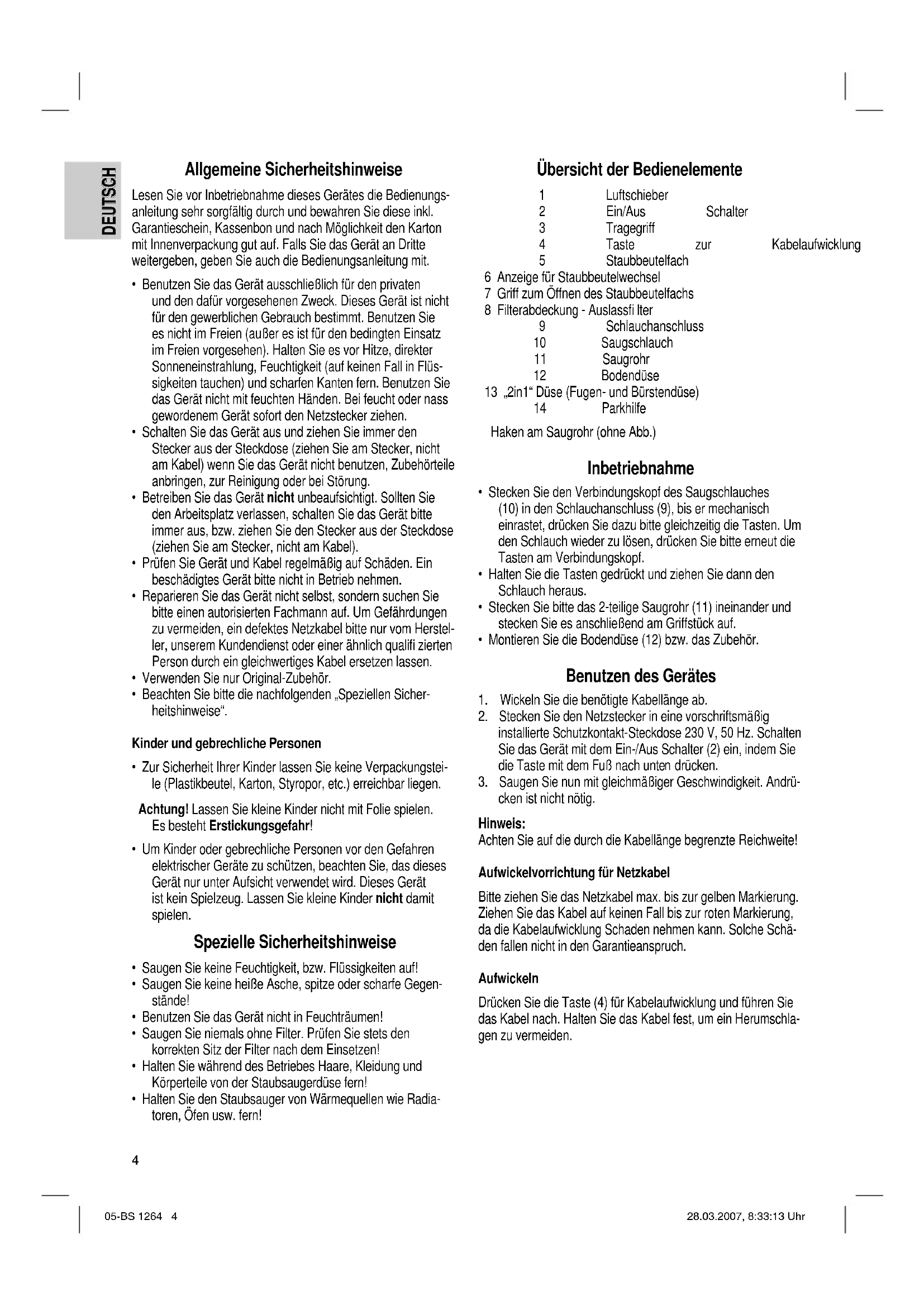 cken ist nicht nötig. Hinweis: Achten Sie auf die durch die Kabellänge begrenzte Reichweite! Aufwickelvorrichtung für Netzkabel Bitte ziehen Sie das Netzkabel max. bis zur gelben Markierung. Ziehen Sie das Kabel auf keinen Fall bis zur roten Markierung, da die Kabelaufwicklung Schaden nehmen kann. Solche Schä- den fallen nicht in den Garantieanspruch. Aufwickeln Drücken Sie die Taste (4) für Kabelaufwicklung und führen Sie das Kabel nach. Halten Sie das Kabel fest, um ein Herumschla- gen zu vermeiden. 05-BS 1264 4 28.03.2007, 8:33:13 Uhr5 DEUTSCH DEUTSCH Düsenaufsätze Fugen-, Bürstdüse: Zum Saugen von Polstern, Vorhängen und in Ecken und Schlitzen usw. „2 in 1“ Düse: Zusammengesteckt kön- nen Sie sie als Bürstendüse benutzen. Möchten Sie die Fugendüse verwenden, ziehen Sie den Bürstenteil ab. Bodendüse: Zur Reinigung von Teppichen oder glatten Flächen. Lösen der Düsen: Ziehen Sie diese unter leichtem Drehen ab. Luftschieber (1) Öffnen Sie den Luftschieber am Schlauchgriff zur Luftregulie- rung oder, um an der Düse haftende Teile zu lösen. Anzeige Staubbeutelwechsel (6) Halten Sie den Saugschlauch unbelastet in die Luft. Ist die Anzeige rot, ist der Beutel voll. Wechseln Sie ihn bitte aus. Auswechseln des Staubbeutels