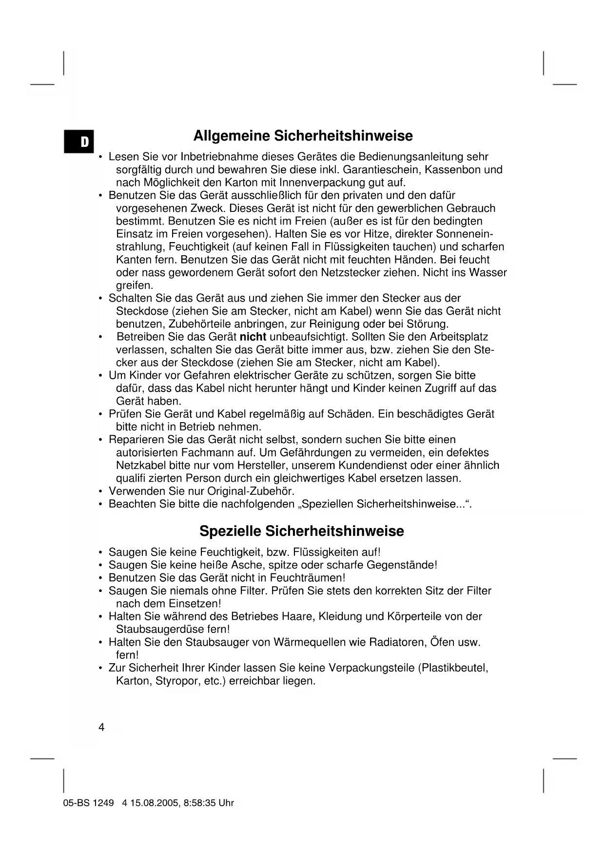 - Zur Sicherheit Ihrer Kinder lassen Sie keine Verpackungsteile (Plastikbeutel, Karton, Styropor, etc.) erreichbar liegen. 05-BS 1249 4 15.08.2005, 8:58:35 UhrD