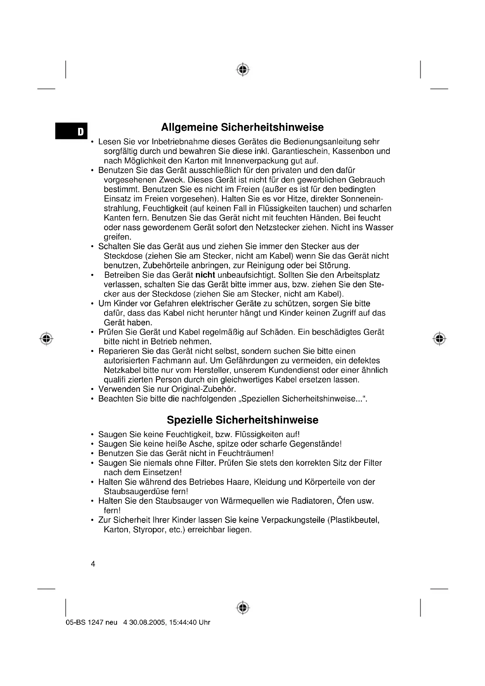 - Zur Sicherheit Ihrer Kinder lassen Sie keine Verpackungsteile (Plastikbeutel, Karton, Styropor, etc.) erreichbar liegen. 05-BS 1247 neu 4 30.08.2005, 15:44:40 UhrD