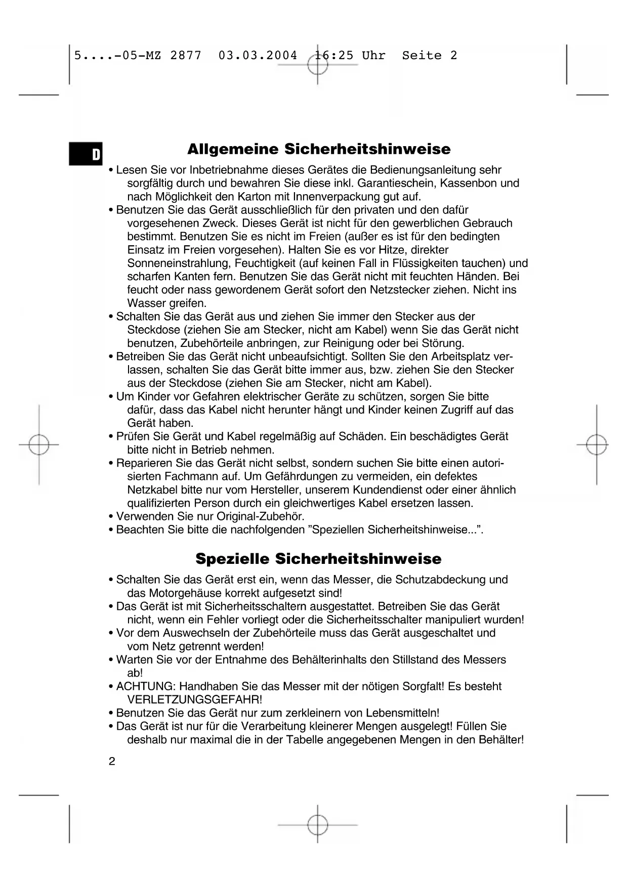 5....-05-MZ 2877 03.03.2004 16:25 Uhr Seite 2• Füllen Sie keine harten Speisen wie z.B. Eiswürfel, Muskatnuss oder große Stücke Blockschokolade, in den Behälter! Das Messer kann dadurch zerstört werden! Inbetriebnahme Vor der ersten Inbetriebnahme sollten Sie den transparenten Behälter, die Schutzabdeckung und das Messer in einem einfachen Spülbad reinigen. ACHTUNG: Handhaben Sie das Messer mit der nötigen Sorgfalt! Es besteht VERLETZUNGSGEFAHR!