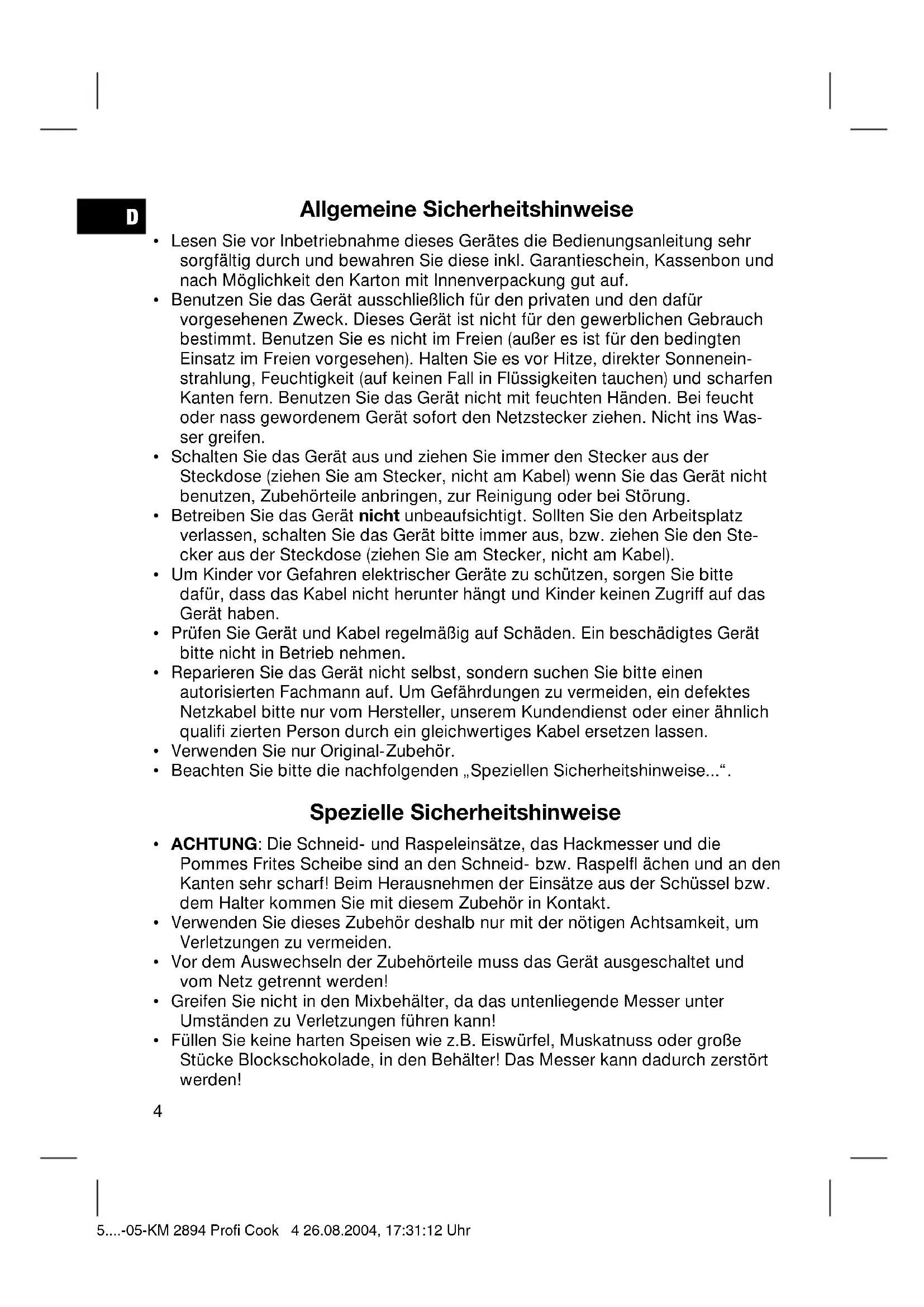 - Füllen Sie keine harten Speisen wie z.B. Eiswürfel, Muskatnuss oder große Stücke Blockschokolade, in den Behälter! Das Messer kann dadurch zerstört werden! 5....-05-KM 2894 Profi Cook 4 26.08.2004, 17:31:12 UhrD