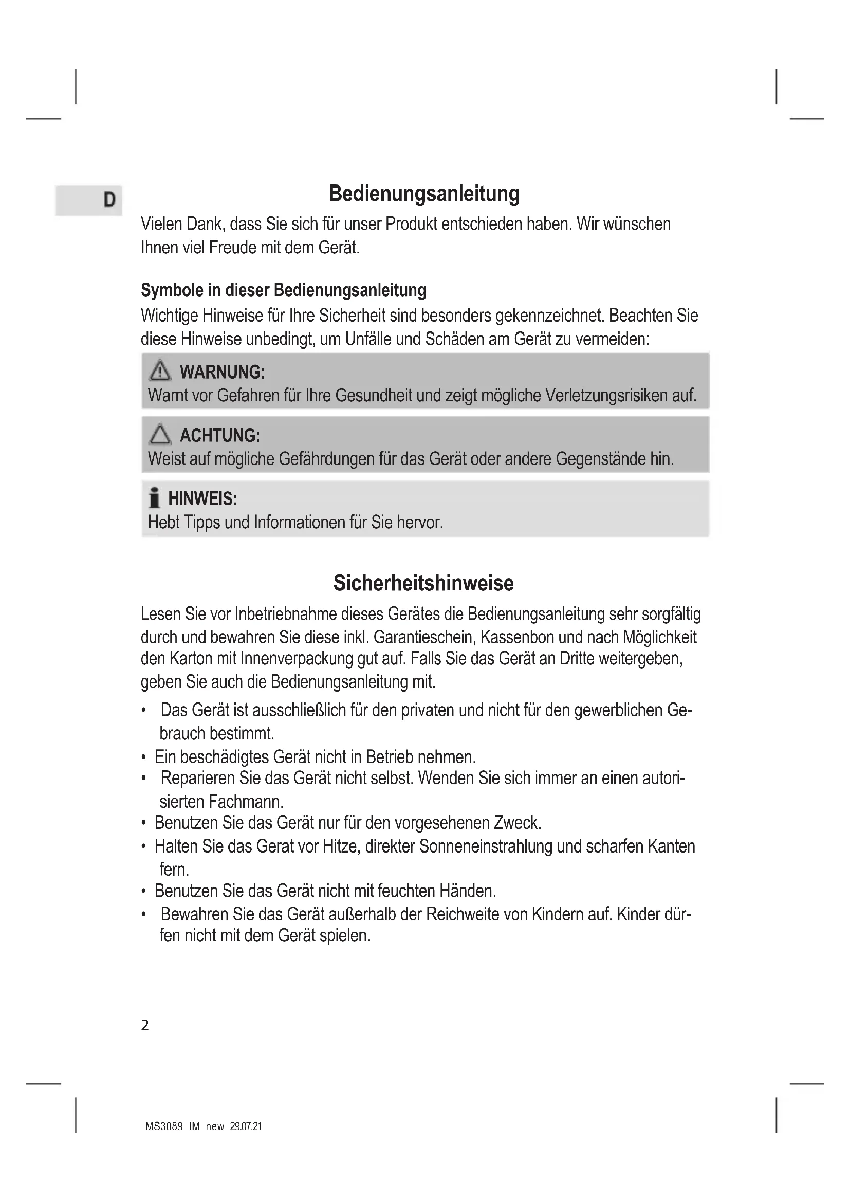 - Bewahren Sie das Gerät außerhalb der Reichweite von Kindern auf. Kinder dür- fen nicht mit dem Gerät spielen.3 MS3089_IM_new 29.07.21