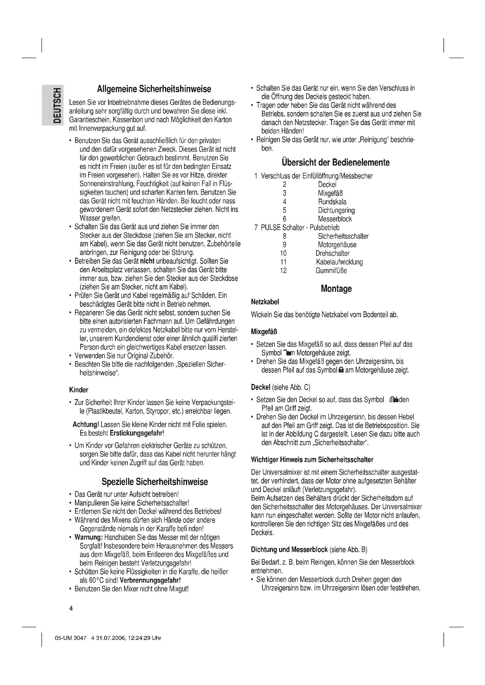 - Sie können den Messerblock durch Drehen gegen den Uhrzeigersinn bzw. im Uhrzeigersinn lösen oder festdrehen. 05-UM 3047 4 31.07.2006, 12:24:29 UhrDEUTSCH
