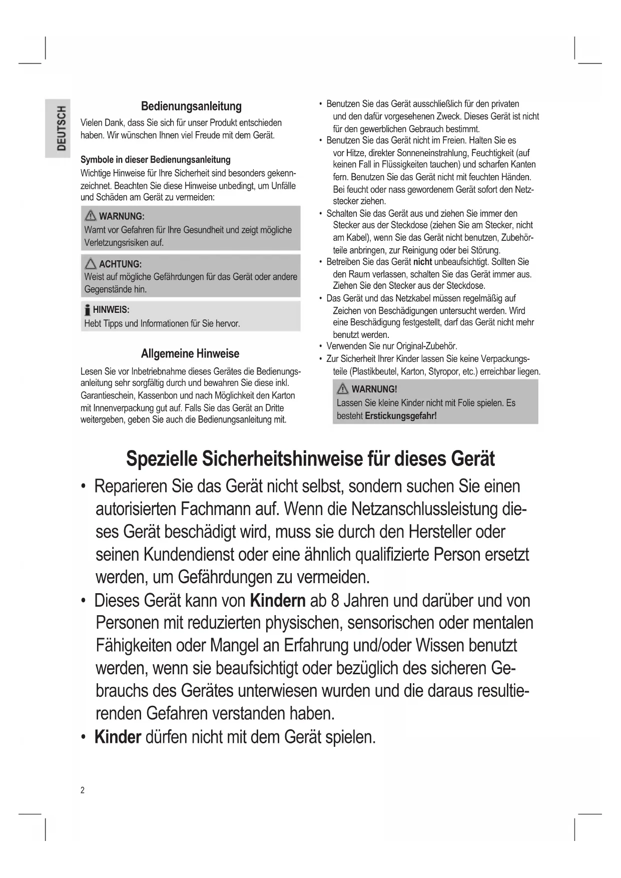 - Benutzen Sie das Gerät ausschließlich für den privaten und den dafür vorgesehenen Zweck. Dieses Gerät ist nicht für den gewerblichen Gebrauch bestimmt.