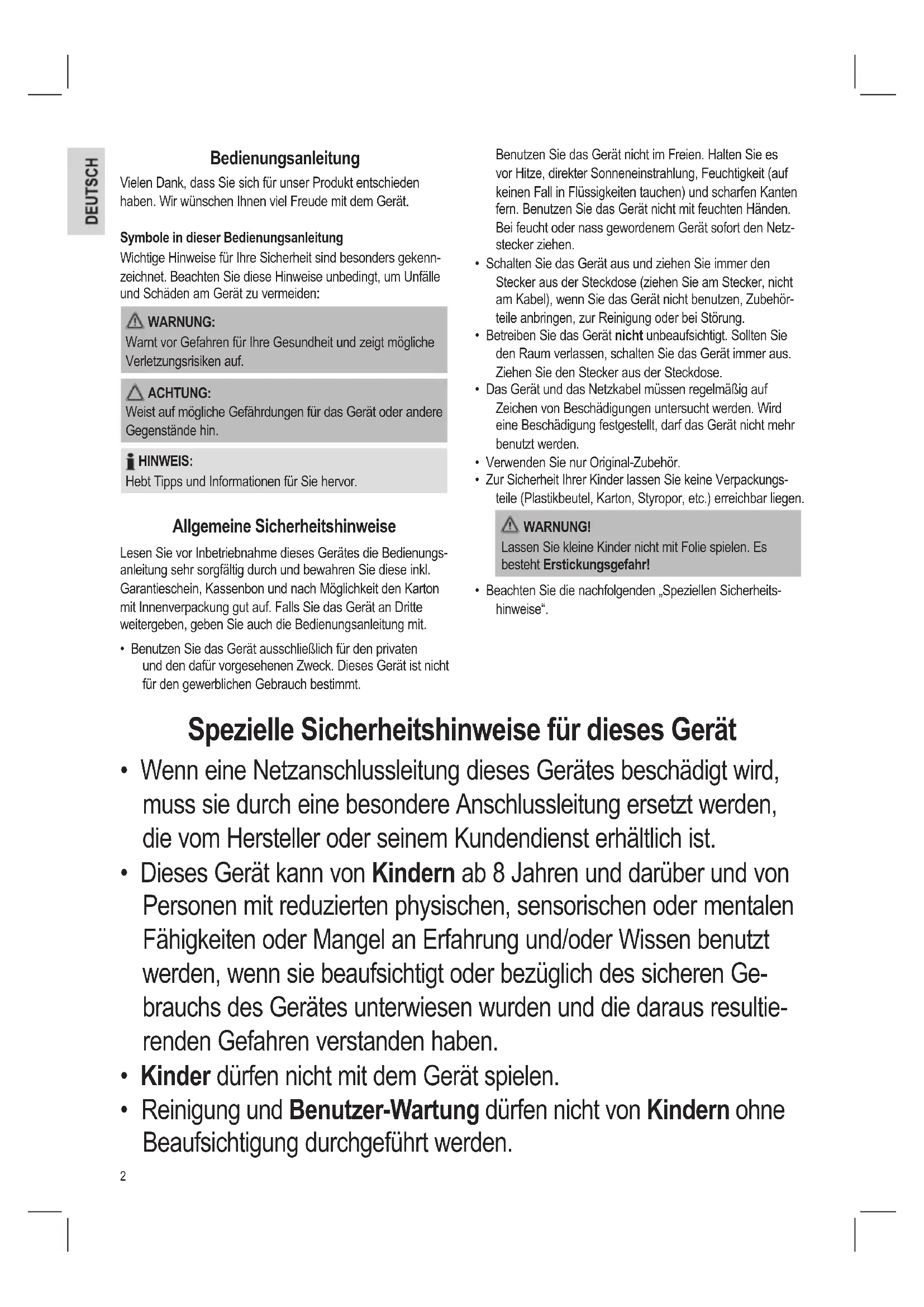 - Benutzen Sie das Gerät ausschließlich für den privaten und den dafür vorgesehenen Zweck. Dieses Gerät ist nicht für den gewerblichen Gebrauch bestimmt. Spezielle Sicherheitshinweise für dieses Gerät