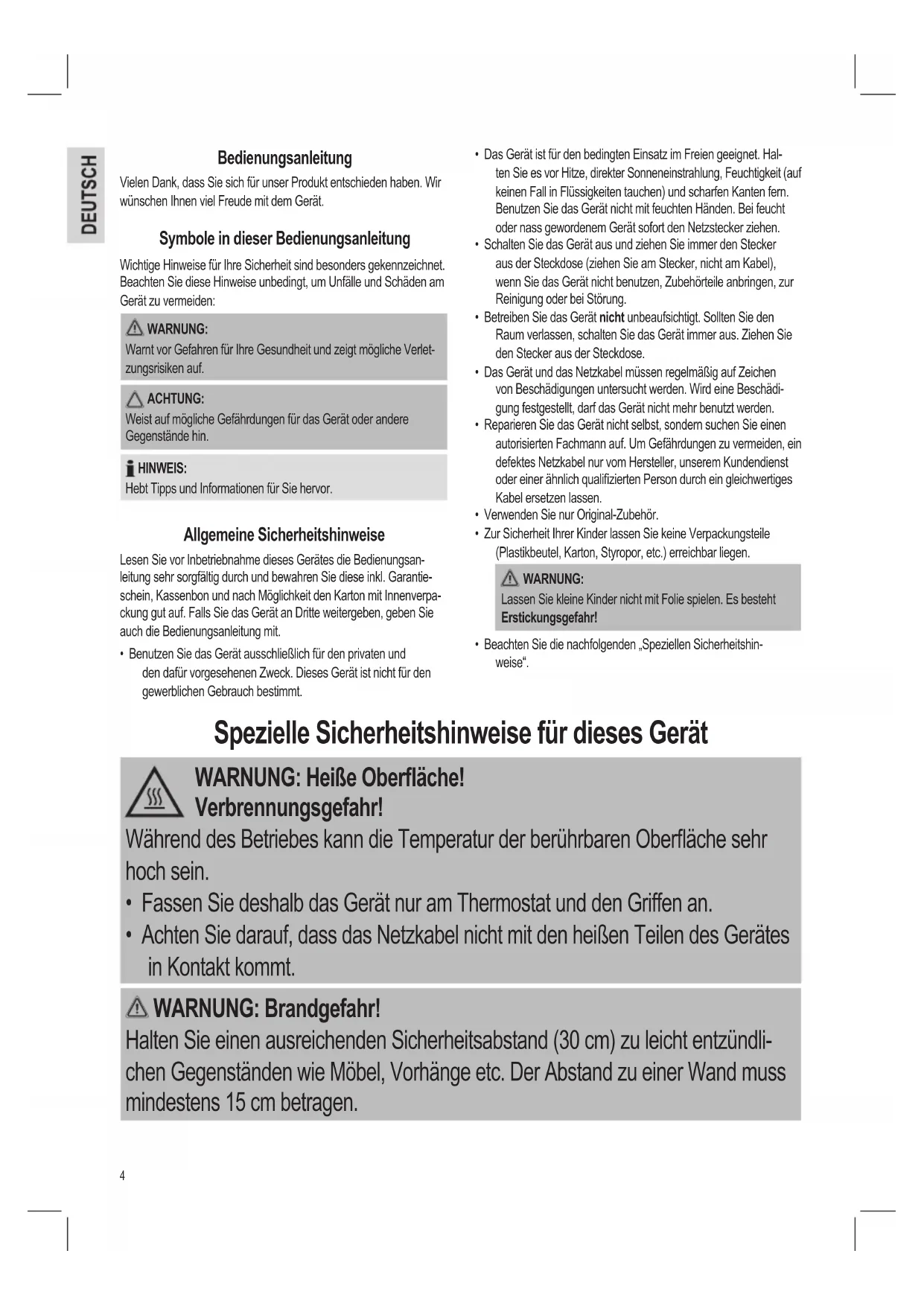 - Betreiben Sie das Gerät nicht unbeaufsichtigt. Sollen Sie den Raum verlassen, schalten Sie das Gerät immer aus. Ziehen Sie den Stecker aus der Steckdose.