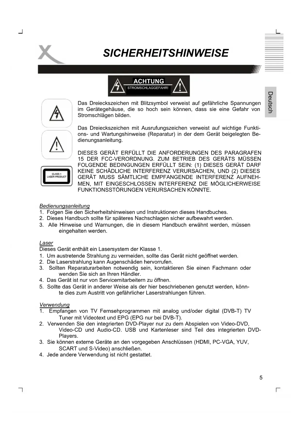 eingehalten werden. Laser Dieses Gerät enthält ein Lasersystem der Klasse 1.