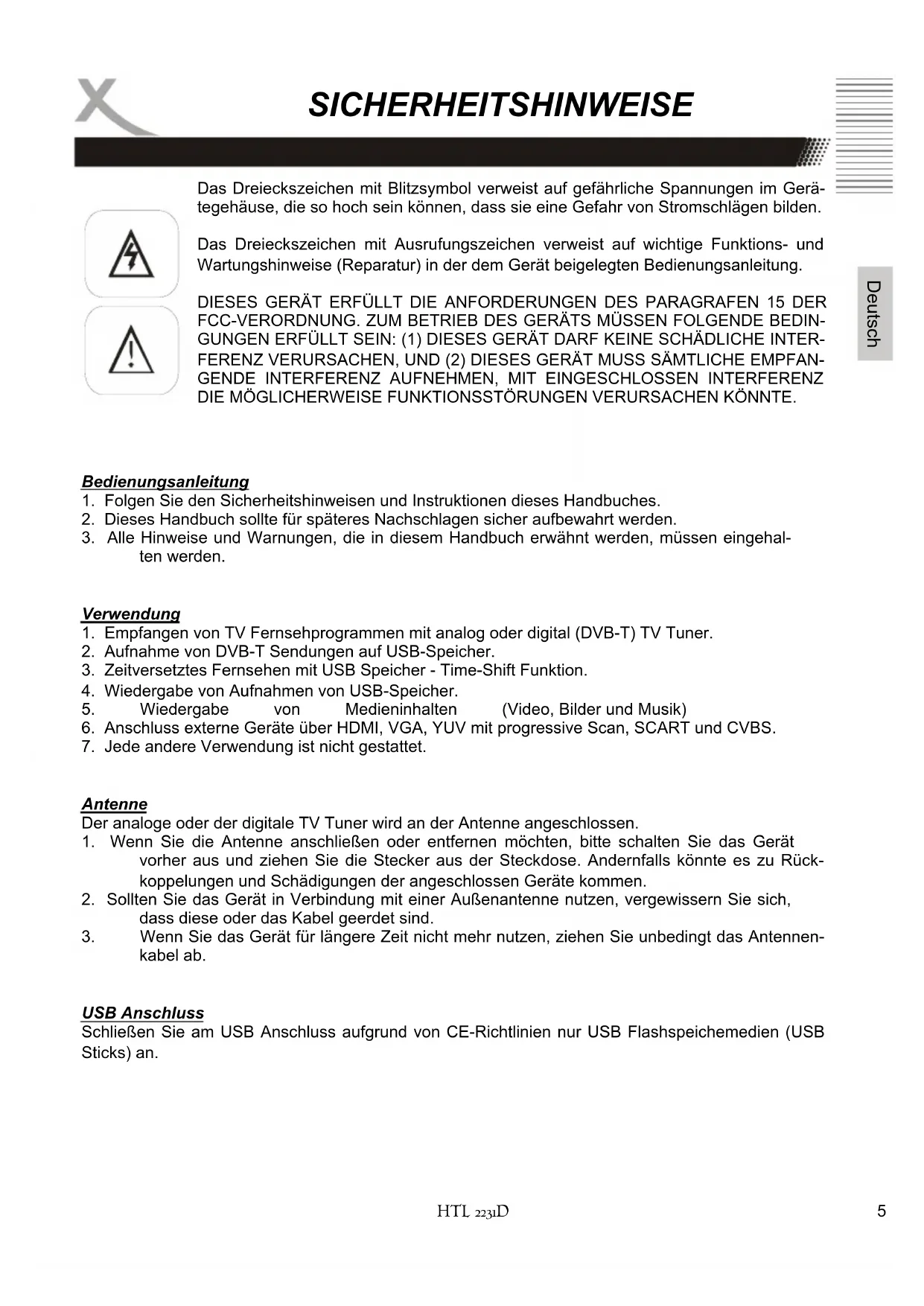 Spezifikationen............................................................................................................. 50 Glossar.......................................................................................................................... 51HTL 2231D 5 Deutsch SICHERHEITSHINWEISE Das Dreieckszeichen mit Blitzsymbol verweist auf gefährliche Spannungen im Gerä- tegehäuse, die so hoch sein können, dass sie eine Gefahr von Stromschlägen bilden. Das Dreieckszeichen mit Ausrufungszeichen verweist auf wichtige Funktions- und Wartungshinweise (Reparatur) in der dem Gerät beigelegten Bedienungsanleitung. DIESES GERÄT ERFÜLLT DIE ANFORDERUNGEN DES PARAGRAFEN 15 DER FCC-VERORDNUNG. ZUM BETRIEB DES GERÄTS MÜSSEN FOLGENDE BEDIN- GUNGEN ERFÜLLT SEIN: (1) DIESES GERÄT DARF KEINE SCHÄDLICHE INTER- FERENZ VERURSACHEN, UND (2) DIESES GERÄT MUSS SÄMTLICHE EMPFAN-
