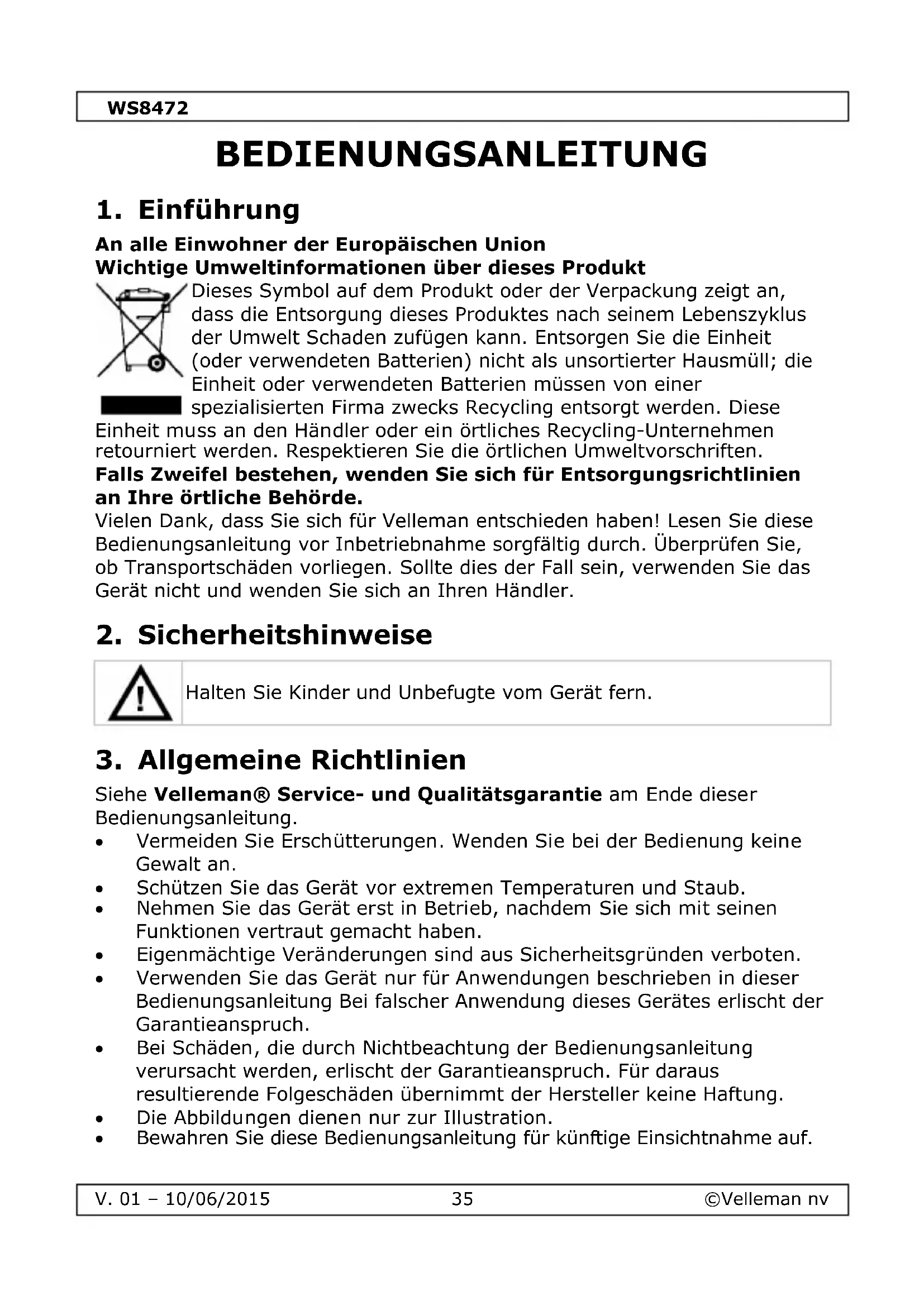 Finden Sie kostenlos die Bedienungsanleitung des Geräts WS8472 VELLEMAN als PDF.