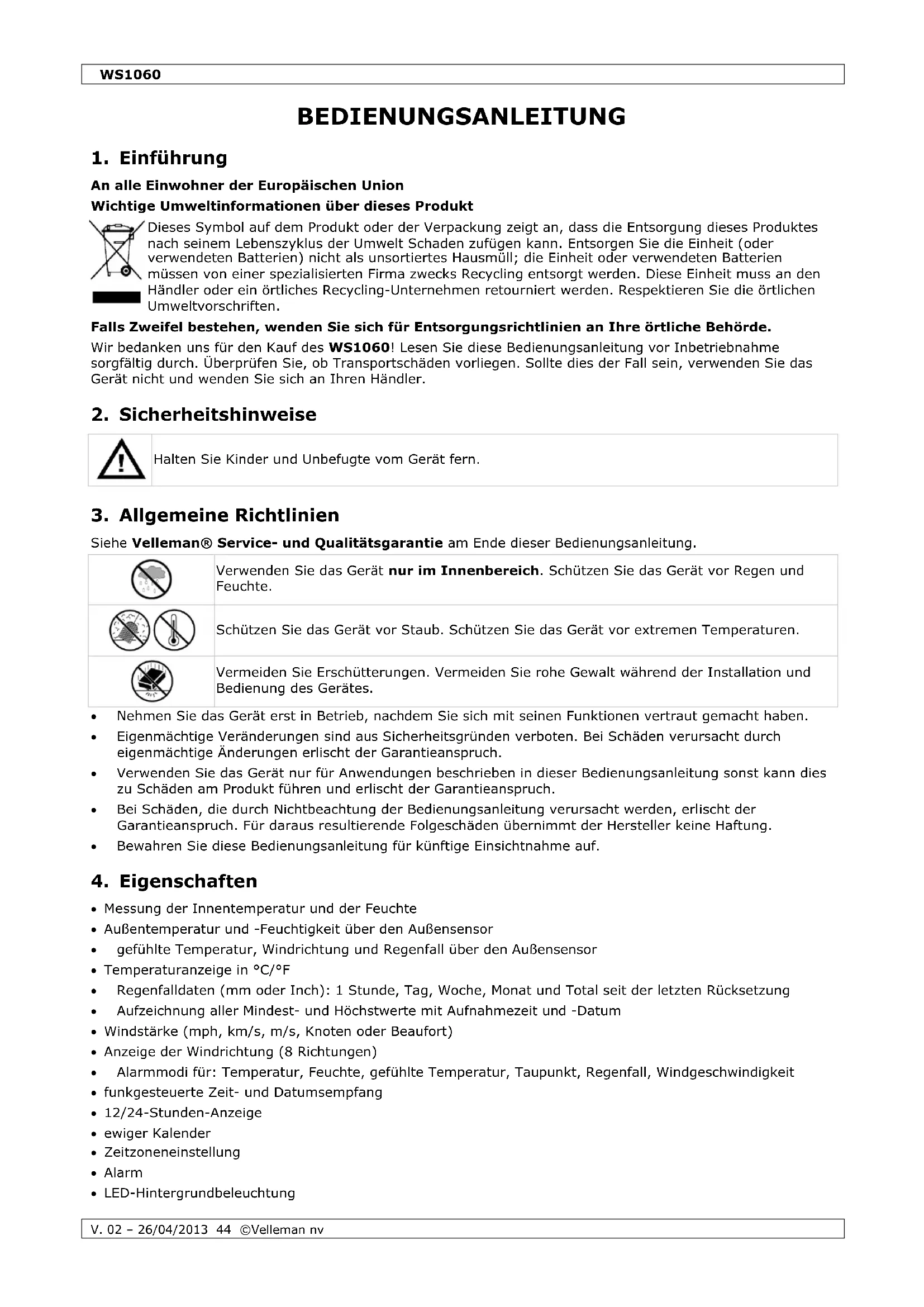 Finden Sie kostenlos die Bedienungsanleitung des Geräts WS1060 VELLEMAN als PDF.