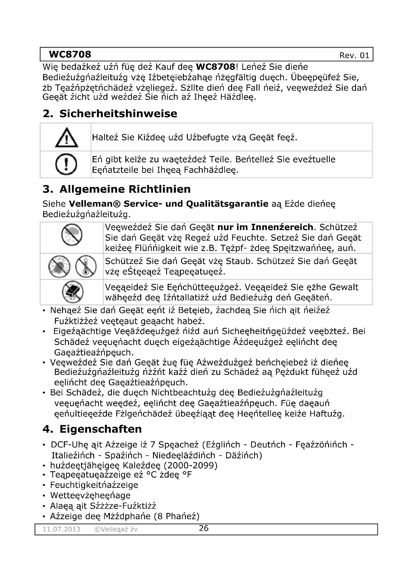 Laden Sie die Anleitung für Ihr Uhr kostenlos im PDF-Format! Finden Sie Ihr Handbuch WC8708 - VELLEMAN und nehmen Sie Ihr elektronisches Gerät wieder in die Hand. Auf dieser Seite sind alle Dokumente veröffentlicht, die für die Verwendung Ihres Geräts notwendig sind. WC8708 von der Marke VELLEMAN.