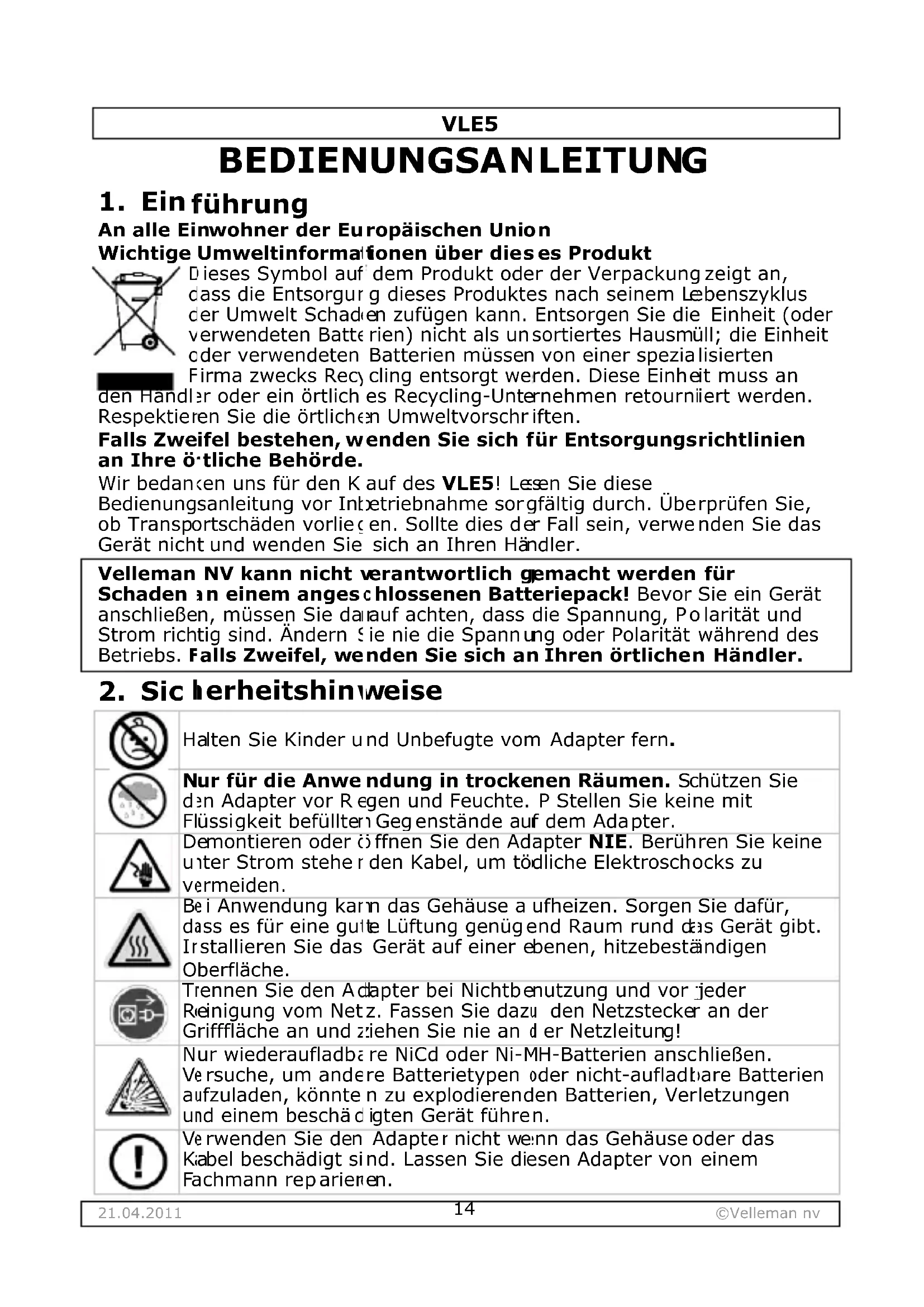 VLE5 - Batterieladegerät VELLEMAN - Kostenlose Bedienungsanleitung