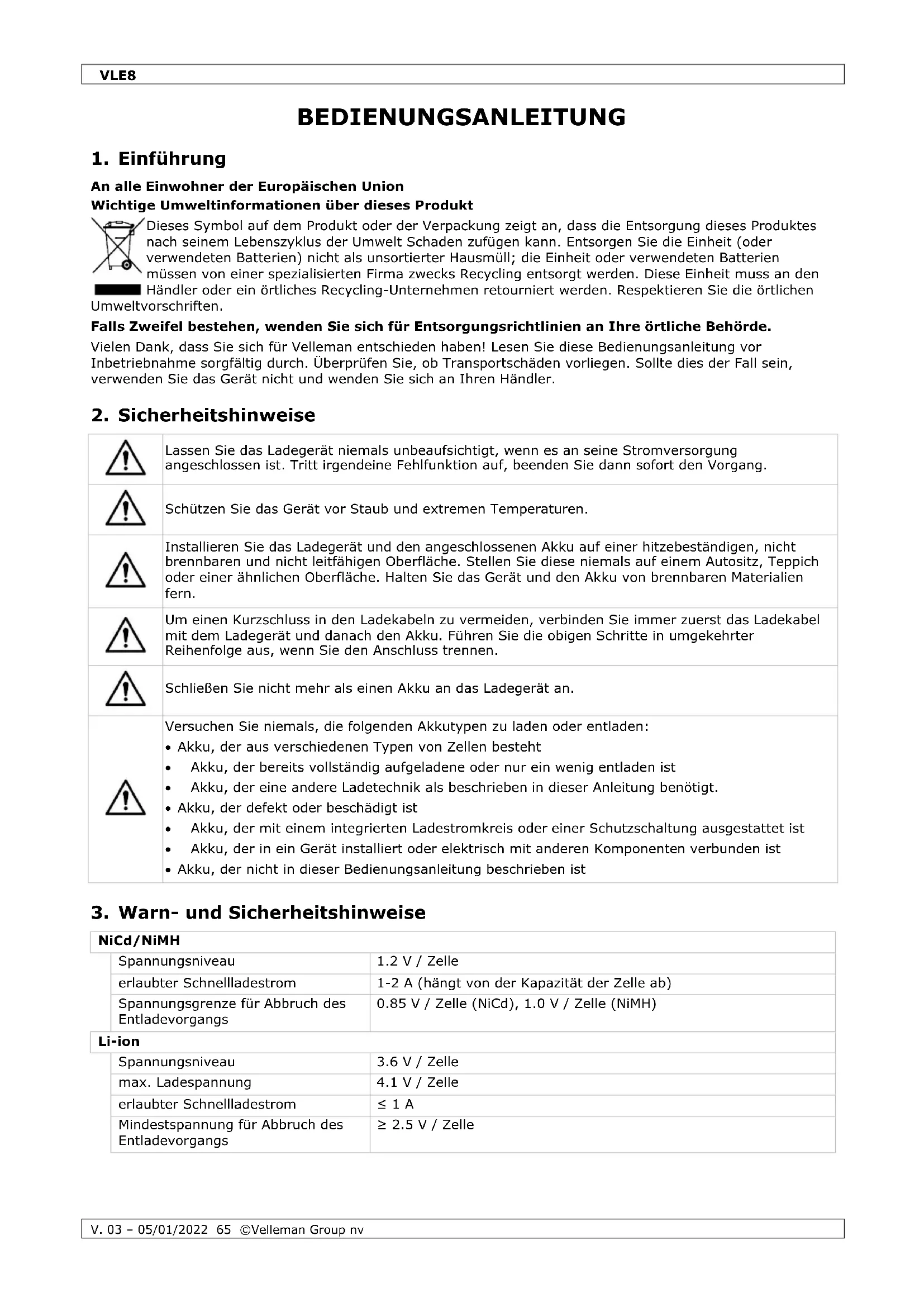 VLE8 - Batterieladegerät VELLEMAN - Kostenlose Bedienungsanleitung
