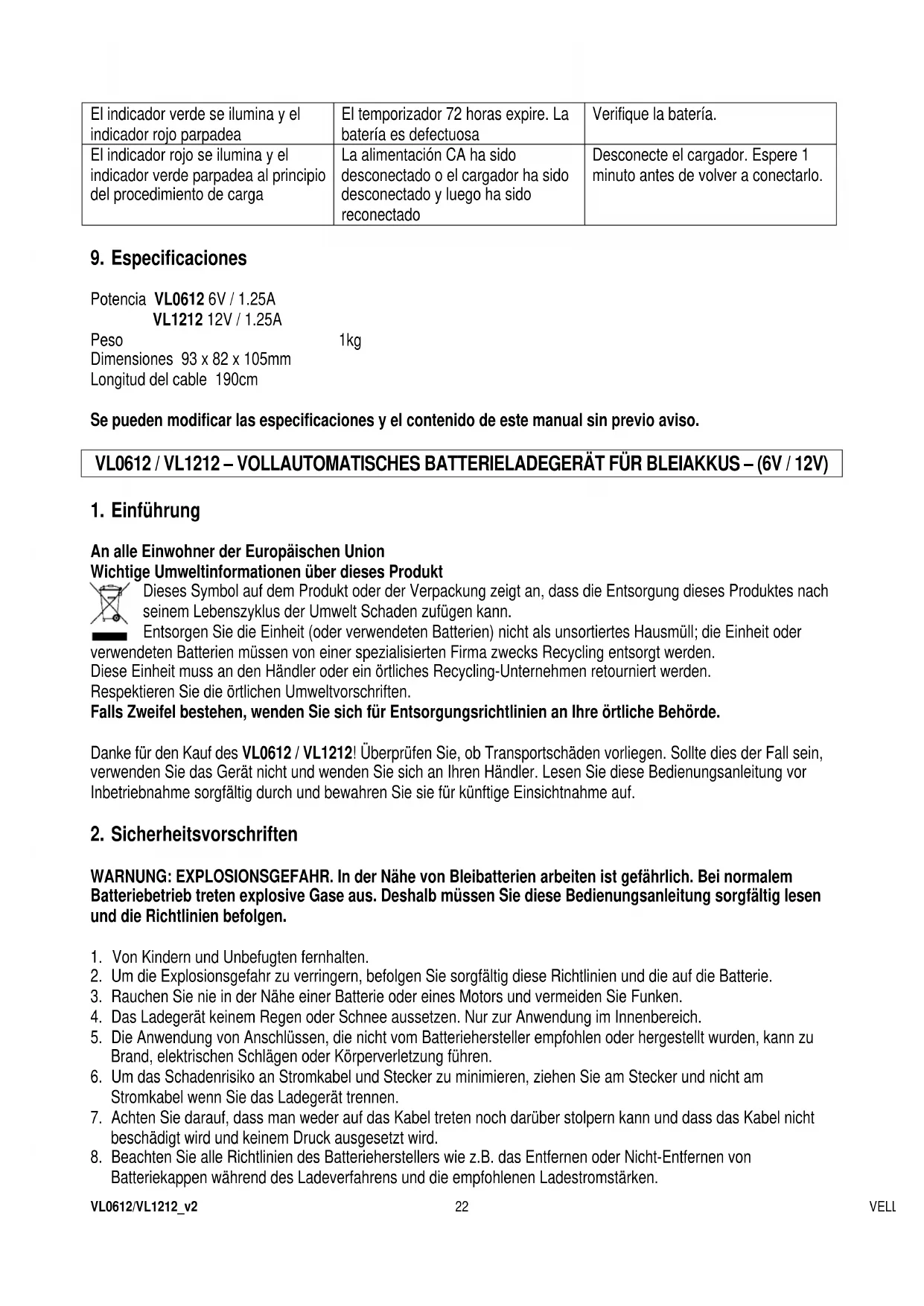 a. Automatische Überwachung Ihr neues Batterieladegerät ist völlig automatisch und kann eingeschaltet bleiben immer wenn Stromversorgung verfügbar ist. Die Ausgangsleistung hängt von dem Zustand der Batterie ab. Wenn die Batterie völlig aufgeladen ist, wird die Kontrollleuchte grün werden und wird das Ladegerät auf Erhaltungsladung umschalten und die Batterie auf voller Ladekapazität halten. b. Kabelverbindungen Das Ladegerät hat 2 Ausgangskabel, ein rotes positives Kabel und ein schwarzes negatives Kabel. Die Kabel nur anschließen oder entfernen bevor das Gerät an eine AC-Steckdose angeschlossen wird. Für alle Batterietypen: verbinden Sie das rote positive Kabel (+) mit dem positiven Batterieanschluss. Verbinden Sie das negative schwarze Kabel (-) mit dem negativen Batterieanschluss. Wenn das Ladegerät langfristig an die Batterie angeschossen ist, kontrollieren Sie die Wasserpegel (gemäß den Richtlinien des Batterieherstellers), sodass der Wasserpegel korrekt bleibt. ACHTUNG: Ihr Ladegerät hat funkenfreie Schaltkreise! Die Klemmen werden keine Funken auslösen wenn Sie sich berühren. Es wird auch keine Spannung erzeugen (wenn eingeschaltet) bis es mindestens 3V von der Batterie detektiert. Das Ladegerät muss an eine Batterie angeschlossen sein um funktionieren zu können. Die Klemmen müssen mit richtiger Polarität an die Batterie angeschlossen werden um eine Ausgangsspannung zu erzeugen. Mit anderen Worten, wenn Sie ein AC Stromkabel an eine 230V Stromquelle anschließen, werden die Klemmen keine Funken auslösen wenn sie sich berühren. Die Klemmen müssen an eine Batterie angeschlossen sein um eine Ausgangsspannung erzeugen zu können. Wenn das Ladegerät umgekehrt angeschlossen ist, wird die rote Kontrollleuchte blinken, als Zeichen, dass kein Ladevorgang gestartet wurde. Die Klemmen müssen richtig angeschlossen werden (Polarität!) um das Ladegerät zu starten (rot an positiv (+ an +) und schwarz an negativ (- an -)). Schalten Sie das Gerät nie ein und sofort wieder aus. Wenn das trotzdem doch geschieht, trennen Sie das Gerät vom Netz, warten Sie einige Minuten und schalten Sie es wieder ein.VL0612/VL1212_v2 VELLEMAN