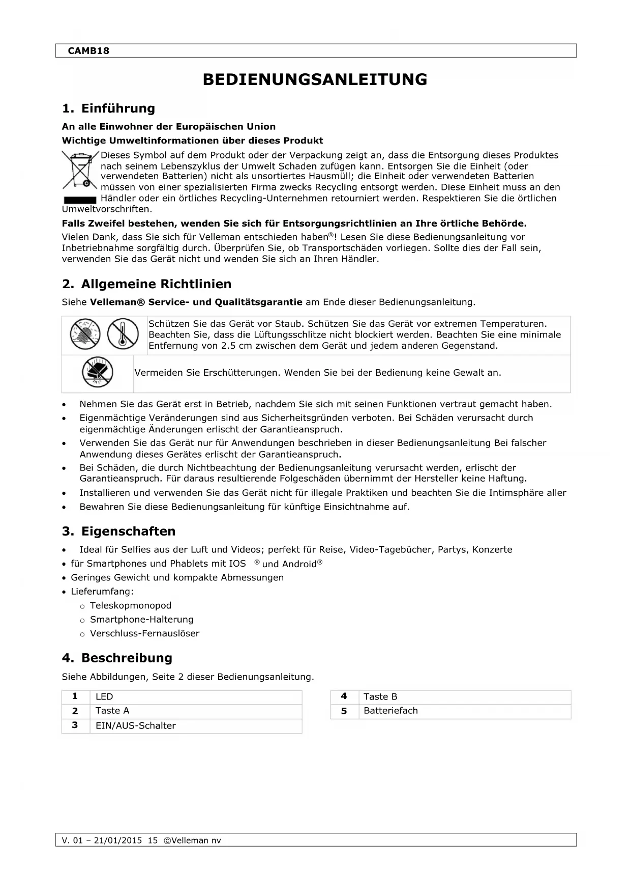 Laden Sie die Anleitung für Ihr Stativ kostenlos im PDF-Format! Finden Sie Ihr Handbuch CAMB18 - VELLEMAN und nehmen Sie Ihr elektronisches Gerät wieder in die Hand. Auf dieser Seite sind alle Dokumente veröffentlicht, die für die Verwendung Ihres Geräts notwendig sind. CAMB18 von der Marke VELLEMAN.