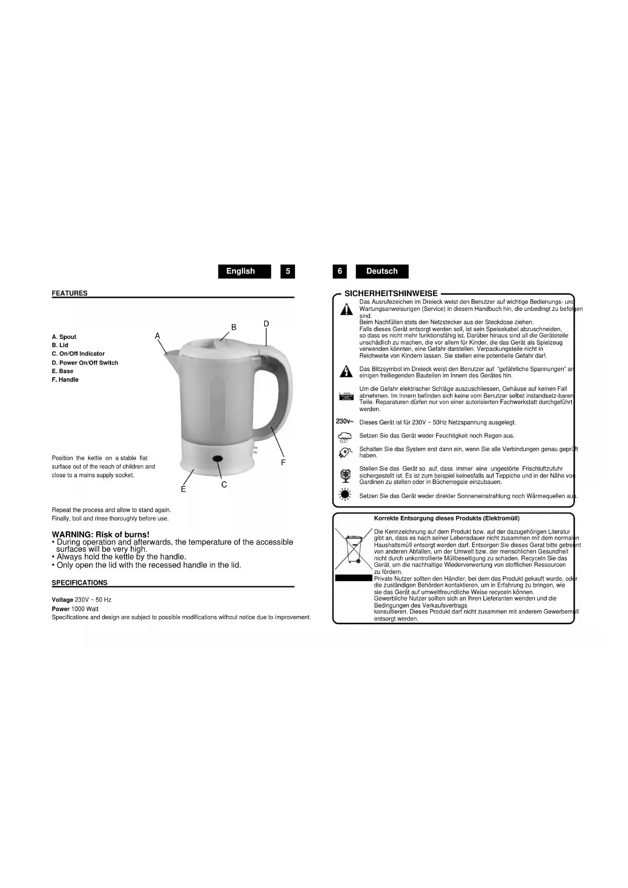 - Es gibt im Inneren keine Teile, die der Benutzer selbst reparieren könnte. Sich für die erforderliche Wartung an qualifiziertes Personal wenden. Deutsch DeutschEntkrusten Beim Wasserkocher mindestens zweimal im Jahr mit Hilfe eines speziellen Entkalkers für Lebensmittelbehälter die Kruste entfernen (sorgfältig die Herstelleranweisungen befolgen). Als Alternative dazu die Hälfte des Wasserkochers mit Wasser befüllen, dann den Saft einer Zitrone oder Essig hinzufügen, kochen lassen und dann 15 Minuten abkühlen lassen. Die Prozedur wiederholen und erneut abkühlen lassen. Schließlich erneut aufkochen lassen und vor dem Gebrauch gründlich ausspülen. EIGENSCHAFTEN A. Tülle B. Deckel C. ON/Off Anzeige (ein/aus) D. ON/Off Schalter (ein/aus) E. Base F. Griff Den Wasserkocher auf eine ebene und stabile Fläche stellen, außerhalb der Reichweite von Kindern und in der Nähe einer Steckdose. Sich vergewissern, dass das Stromkabel nicht so positioniert ist, dass es gezogen oder eingehakt werden kann. TECHNISCHE DATEN Stromversorgung 230V ~ 50 Hz Leistung 1.000 Watt Auf Grund ständiger Verbesserungen bleibt die Änderung der technischen Daten und des Designs ohne Vorankündigung vorbehalten.