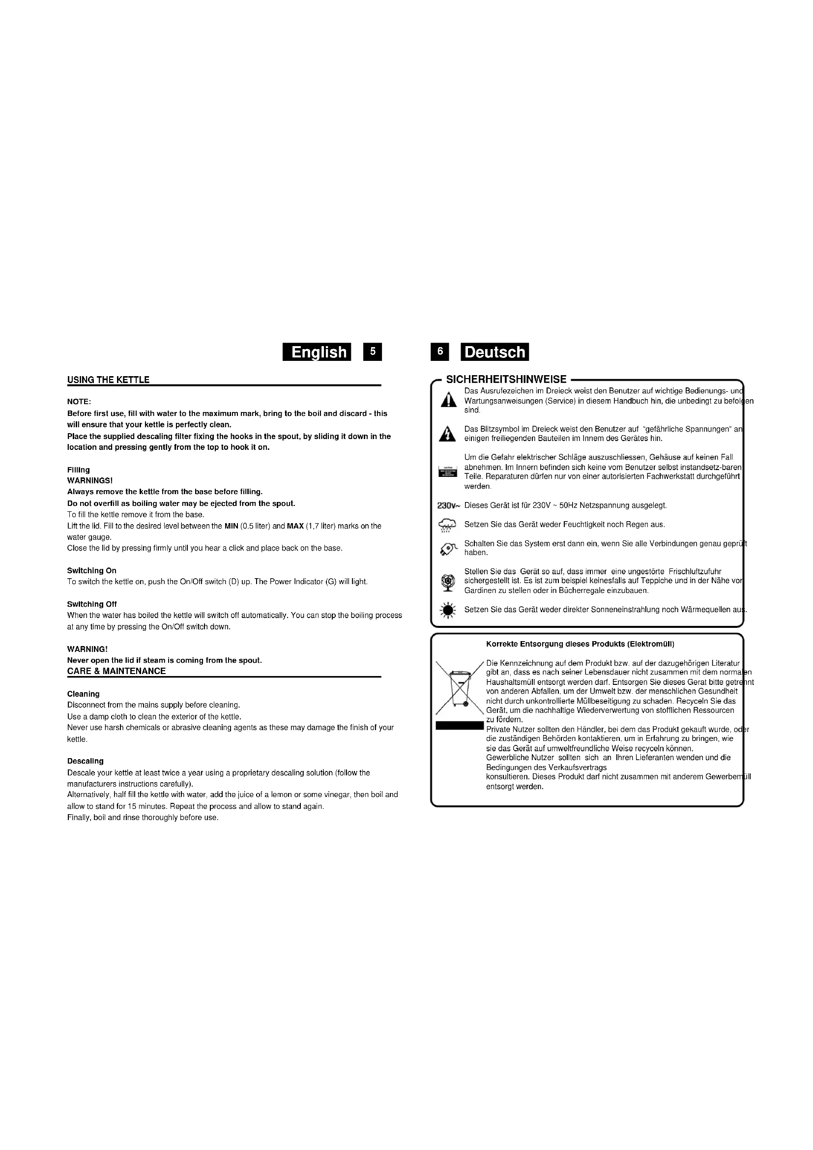 NOTE: Before first use, fill with water to the maximum mark, bring to the boil and discard - this will ensure that your kettle is perfectly clean. Place the supplied descaling filter fixing the hooks in the spout, by sliding it down in the location and pressing gently from the top to hook it on. Filling WARNINGS! Always remove the kettle from the base before filling. Do not overfill as boiling water may be ejected from the spout. To fill the kettle remove it from the base. Lift the lid. Fill to the desired level between the MIN (0.5 liter) and MAX (1,7 liter) marks on the water gauge. Close the lid by pressing firmly until you hear a click and place back on the base. Switching On To switch the kettle on, push the On/Off switch (D) up. The Power Indicator (G) will light. Switching Off When the water has boiled the kettle will switch off automatically. You can stop the boiling process at any time by pressing the On/Off switch down. WARNING! Never open the lid if steam is coming from the spout. CARE & MAINTENANCE Cleaning Disconnect from the mains supply before cleaning. Use a damp cloth to clean the exterior of the kettle. Never use harsh chemicals or abrasive cleaning agents as these may damage the finish of your kettle. Descaling Descale your kettle at least twice a year using a proprietary descaling solution (follow the manufacturers instructions carefully). Alternatively, half fill the kettle with water, add the juice of a lemon or some vinegar, then boil and allow to stand for 15 minutes. Repeat the process and allow to stand again. Finally, boil and rinse thoroughly before use. English Deutsch SICHERHEITSHINWEISE Das Ausrufezeichen im Dreieck weist den Benutzer auf wichtige Bedienungs- und Wartungsanweisungen (Service) in diesem Handbuch hin, die unbedingt zu befolgen sind. Das Blitzsymbol im Dreieck weist den Benutzer auf “gefährliche Spannungen” an einigen freiliegenden Bauteilen im Innem des Gerätes hin. Um die Gefahr elektrischer Schläge auszuschliessen, Gehäuse auf keinen Fall abnehmen. Im Innern befinden sich keine vom Benutzer selbst instandsetz-baren Teile. Reparaturen dürfen nur von einer autorisierten Fachwerkstatt durchgeführt werden. Dieses Gerät ist für 230V ~ 50Hz Netzspannung ausgelegt. Setzen Sie das Gerät weder Feuchtigkeit noch Regen aus. Schalten Sie das System erst dann ein, wenn Sie alle Verbindungen genau geprüft haben. Stellen Sie das Gerät so auf, dass immer eine ungestörte Frischluftzufuhr sichergestellt ist. Es ist zum beispiel keinesfalls auf Teppiche und in der Nähe von Gardinen zu stellen oder in Bücherregale einzubauen. Setzen Sie das Gerät weder direkter Sonneneinstrahlung noch Wärmequellen aus. Korrekte Entsorgung dieses Produkts (Elektromüll) Die Kennzeichnung auf dem Produkt bzw. auf der dazugehörigen Literatur gibt an, dass es nach seiner Lebensdauer nicht zusammen mit dem normalen HaushaltsmüIl entsorgt werden darf. Entsorgen Sie dieses Gerat bitte getrennt von anderen Abfallen, um der Umwelt bzw. der menschlichen Gesundheit nicht durch unkontrollierte Müllbeseitigung zu schaden. Recyceln Sie das Gerät, um die nachhaltige Wiederverwertung von stofflichen Ressourcen zu fördern. Private Nutzer sollten den Händler, bei dem das Produkt gekauft wurde, oder die zuständigen Behörden kontaktieren, um in Erfahrung zu bringen, wie sie das Gerät auf umweltfreundliche Weise recyceln können. Gewerbliche Nutzer sollten sich an Ihren Lieferanten wenden und die Bedingungen des Verkaufsvertrags konsultieren. Dieses Produkt darf nicht zusammen mit anderem Gewerbemüll entsorgt werden.HK-300S Kabelloser Wasserkocher 1,7 Liter Vor dem Gebrauch Vorsichtig das Gerät aus der Verpackung nehmen. Wer möchte, kann die Verpackung für einen zukünftigen Gebrauch aufbewahren. Sonst umweltgerecht entsorgen. Bitte lesen Sie aufmerksam diese Bedienungsanleitung, um sich mit Ihrem neuen Gerät vertraut zu machen, bevor Sie ihn zum ersten Mal in Betrieb nehmen. Bitte bewahren Sie diese Anleitung auf, um später jederzeit nachschlagen zu können. PACKUNGSINHALT
