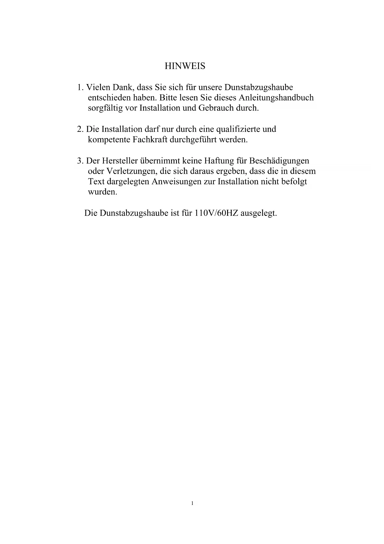oder Verletzungen, die sich daraus ergeben, dass die in diesem Text dargelegten Anweisungen zur Installation nicht befolgt wurden. Die Dunstabzugshaube ist für 110V/60HZ ausgelegt.