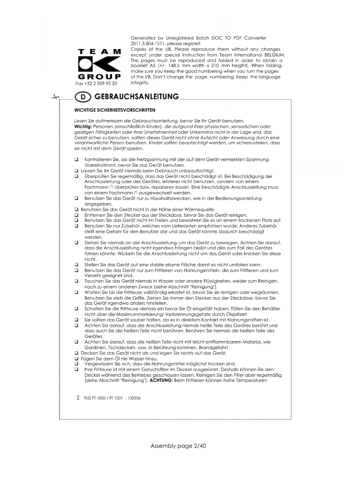 REINIGEN Ziehen Sie den Stecker aus der Steckdose und lassen Sie das Gerät abkühlen, bevor Sie es reinigen. Ziehen Sie immer zuerst die Anschlussleitung aus dem Gerät, bevor Sie das Gerät reinigen. Benutzen Sie keine Scheuermittel oder Topfkratzer, da Ihre Fritteuse dadurch beschädigt werden könnte.Generated by Unregistered Batch DOC TO PDF Converter 2011.3.804.1511, please register! Copies of the I/B. Please reproduce them without any changes except under special instruction from Team International BELGIUM. The pages must be reproduced and folded in order to obtain a booklet A5 (+/- 148.5 mm width x 210 mm height). When folding, make sure you keep the good numbering when you turn the pages of the I/B. Don‟t change the page numbering. Keep the language integrity.