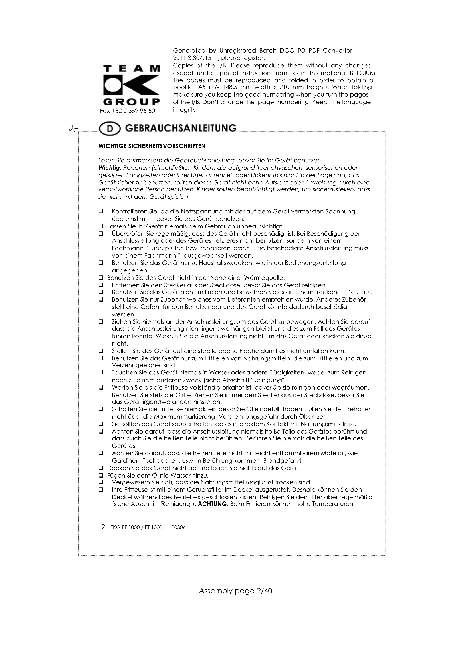 REINIGEN Ziehen Sie den Stecker aus der Steckdose und lassen Sie das Gerät abkühlen, bevor Sie es reinigen. Ziehen Sie immer zuerst die Anschlussleitung aus dem Gerät, bevor Sie das Gerät reinigen. Benutzen Sie keine Scheuermittel oder Topfkratzer, da Ihre Fritteuse dadurch beschädigt werden könnte.Generated by Unregistered Batch DOC TO PDF Converter 2011.3.804.1511, please register! Copies of the I/B. Please reproduce them without any changes except under special instruction from Team International BELGIUM. The pages must be reproduced and folded in order to obtain a booklet A5 (+/- 148.5 mm width x 210 mm height). When folding, make sure you keep the good numbering when you turn the pages of the I/B. Don‟t change the page numbering. Keep the language integrity.