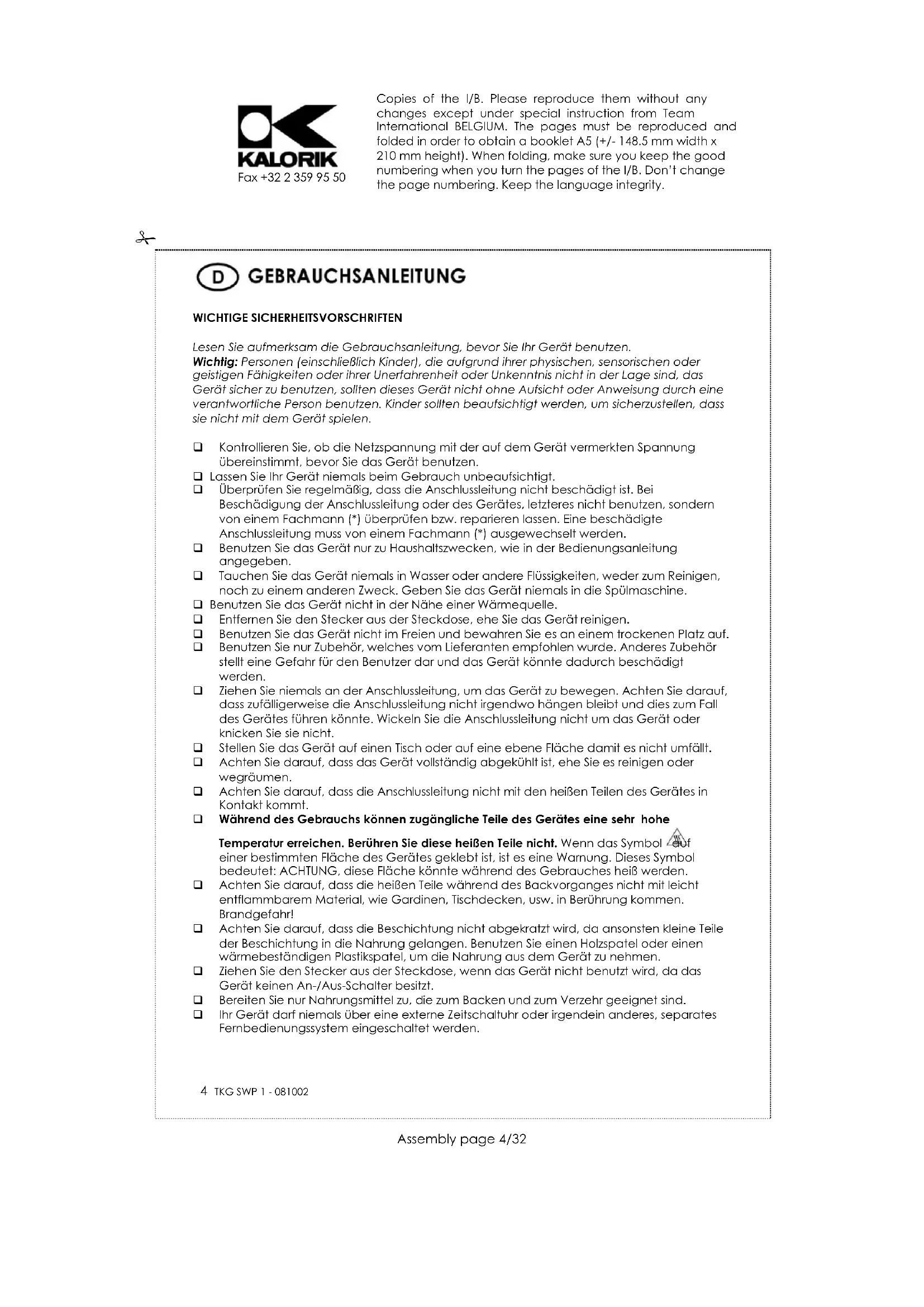Zum Schutz unserer Umwelt und unserer Gesundheit sind Elektro- und Elektronik-Altgeräte nach bestimmten Regeln zu entsorgen. Dies fordert den Einsatz sowohl des Herstellers bzw. Lieferanten als auch des Verbrauchers. Aus diesem Grund darf dieses Gerät, wie das Symbol auf dem Typenschild bzw. auf der Verpackung zeigt, nicht in den unsortierten Restmüll gegeben werden. Der Verbraucher hat das Recht, dieses Gerät über kommunale Sammelstellen zu entsorgen; von dort aus wird die spezifische Behandlung, Verwertung bzw. das Recycling gem. den Erfordernissen der Richtlinie sichergestellt. Copies of the I/B. Please reproduce them without any changes except under special instruction from Team International BELGIUM. The pages must be reproduced and folded in order to obtain a booklet A5 (+/- 148.5 mm width x 210 mm height). When folding, make sure you keep the good numbering when you turn the pages of the I/B. Don’t change the page numbering. Keep the language integrity.