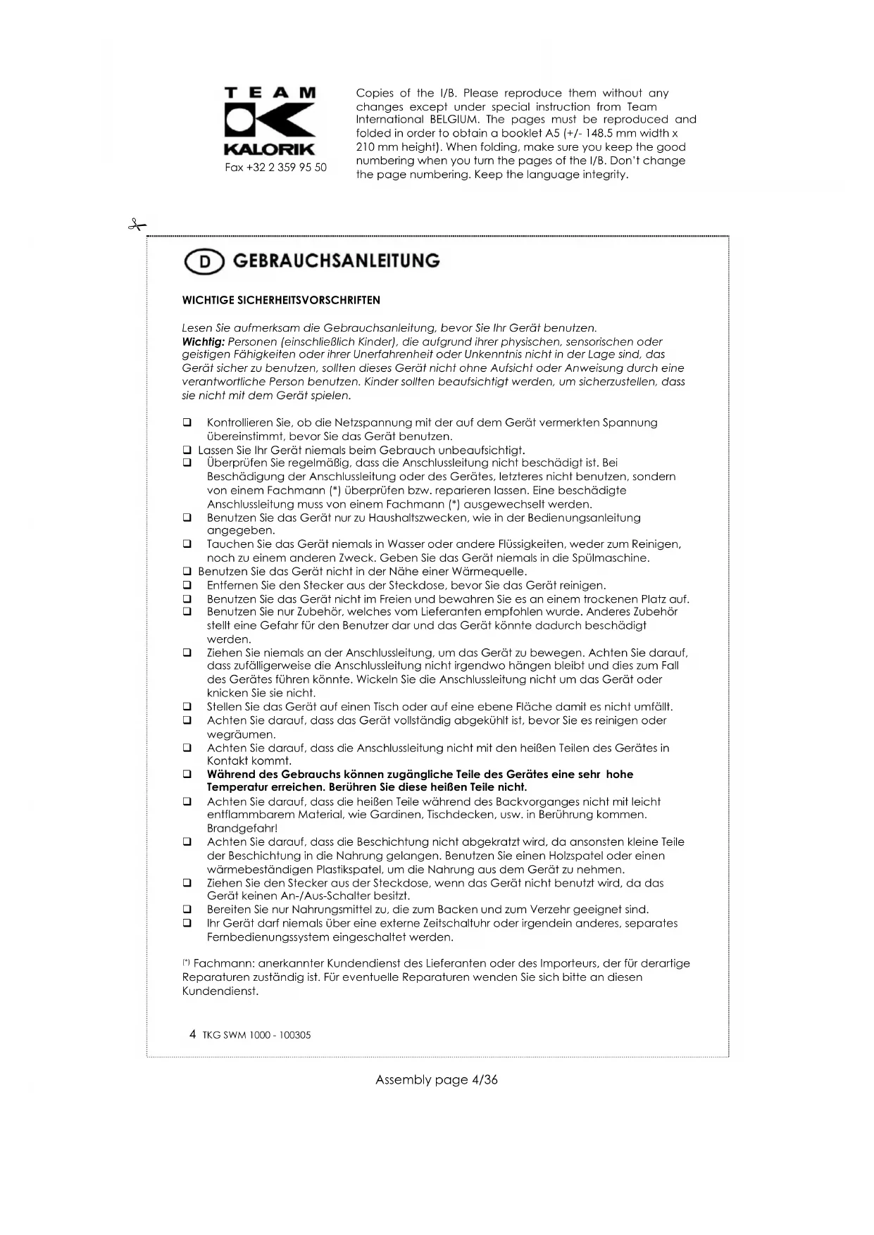 Zum Schutz unserer Umwelt und unserer Gesundheit sind Elektro- und Elektronik-Altgeräte nach bestimmten Regeln zu entsorgen. Dies fordert den Einsatz sowohl des Herstellers bzw. Lieferanten als auch des Verbrauchers. Aus diesem Grund darf dieses Gerät, wie das Symbol auf dem Typenschild bzw. auf der Verpackung zeigt, nicht in den unsortierten Restmüll gegeben werden. Der Verbraucher hat das Recht, dieses Gerät über kommunale Sammelstellen zu entsorgen; von dort aus wird die spezifische Behandlung, Verwertung bzw. das Recycling gem. den Erfordernissen der Richtlinie sichergestellt. Copies of the I/B. Please reproduce them without any changes except under special instruction from Team International BELGIUM. The pages must be reproduced and folded in order to obtain a booklet A5 (+/- 148.5 mm width x 210 mm height). When folding, make sure you keep the good numbering when you turn the pages of the I/B. Don’t change the page numbering. Keep the language integrity.
