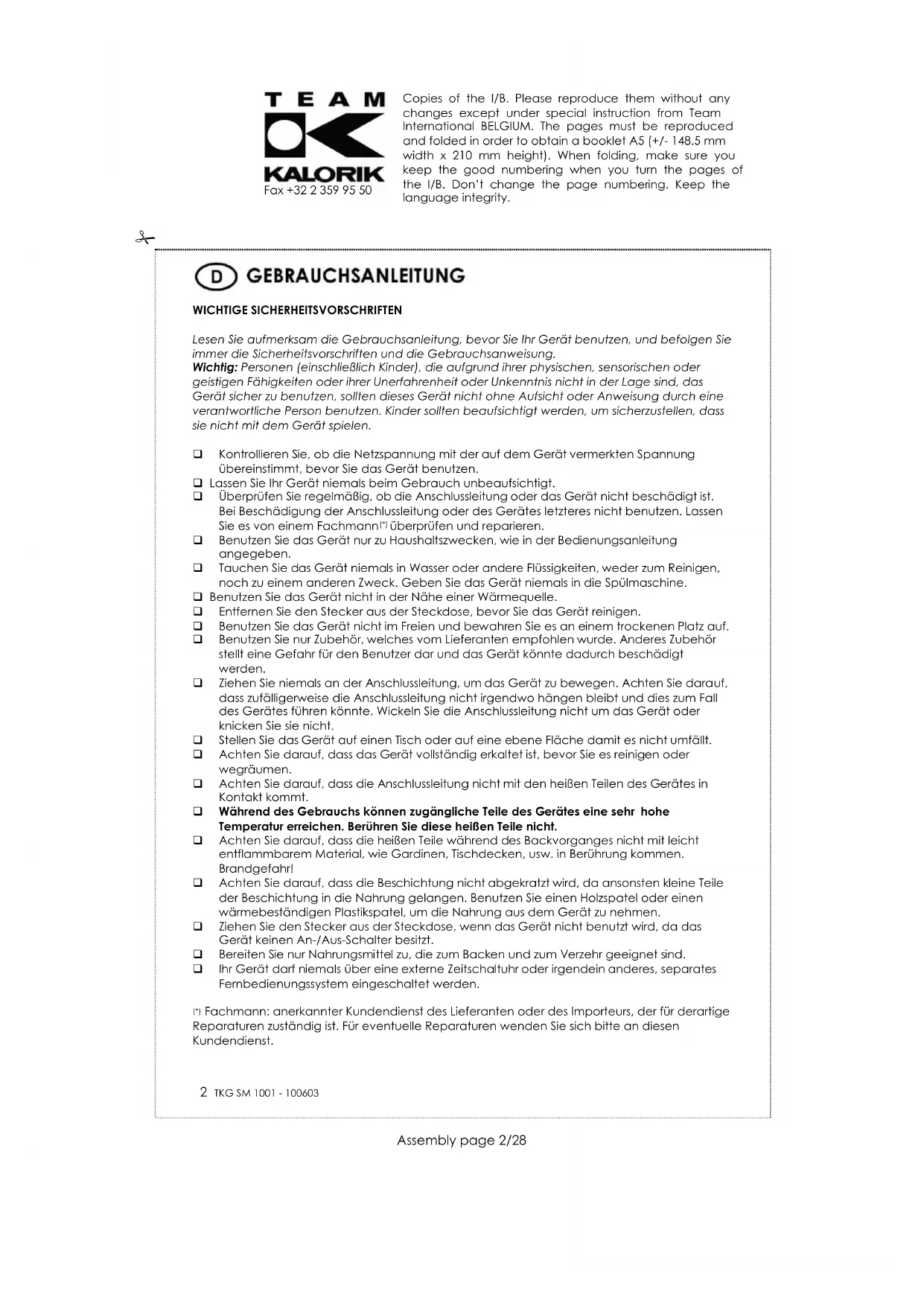 Zum Schutz unserer Umwelt und unserer Gesundheit sind Elektro- und Elektronik-Altgeräte nach bestimmten Regeln zu entsorgen. Dies fordert den Einsatz sowohl des Herstellers bzw. Lieferanten als auch des Verbrauchers. Aus diesem Grund darf dieses Gerät, wie das Symbol auf dem Typenschild bzw. auf der Verpackung zeigt, nicht in den unsortierten Restmüll gegeben werden. Der Verbraucher hat das Recht, dieses Gerät über kommunale Sammelstellen zu entsorgen; von dort aus wird die spezifische Behandlung, Verwertung bzw. das Recycling gem. den Erfordernissen der Richtlinie sichergestellt. Copies of the I/B. Please reproduce them without any changes except under special instruction from Team International BELGIUM. The pages must be reproduced and folded in order to obtain a booklet A5 (+/- 148.5 mm width x 210 mm height). When folding, make sure you keep the good numbering when you turn the pages of the I/B. Don’t change the page numbering. Keep the language integrity.