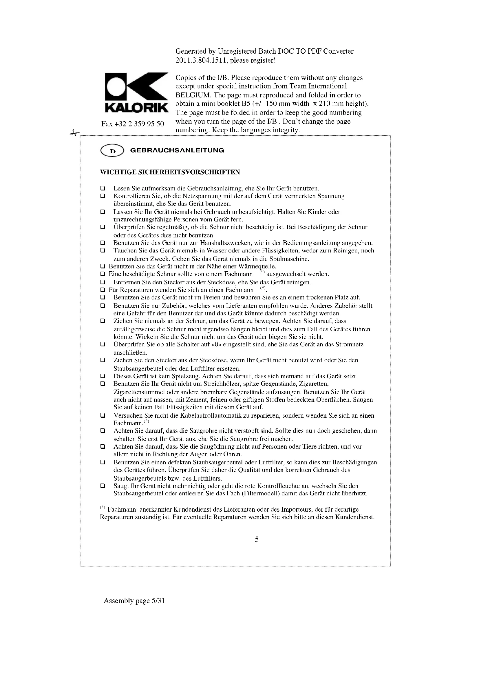 BEDIENUNGSANLEITUNG KA ASP 14 KALORIK