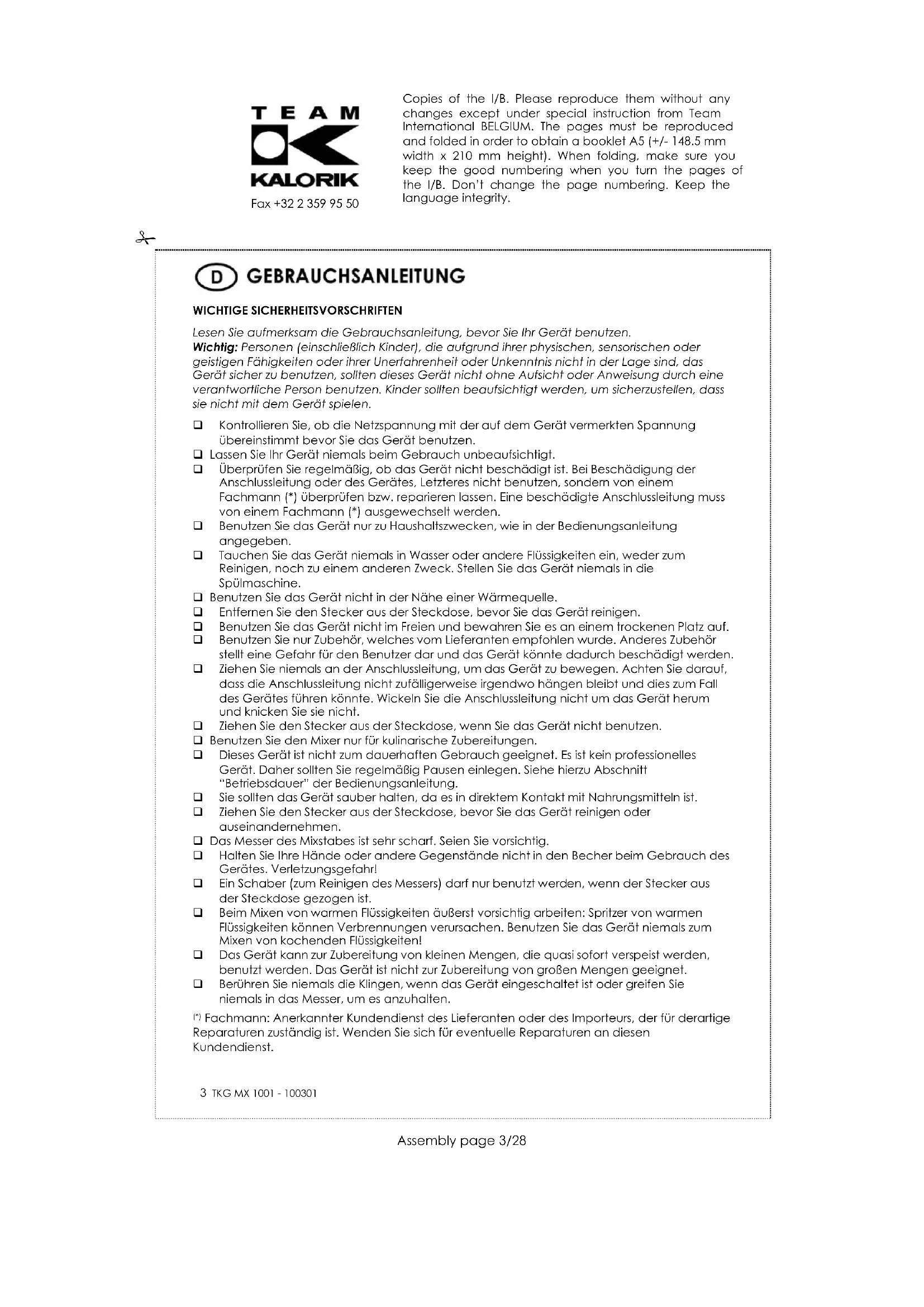 Zum Schutz unserer Umwelt und unserer Gesundheit sind Elektro- und Elektronik-Altgeräte nach bestimmten Regeln zu entsorgen. Dies fordert den Einsatz sowohl des Herstellers bzw. Lieferanten als auch des Verbrauchers. Aus diesem Grund darf dieses Gerät, wie das Symbol auf dem Typenschild bzw. auf der Verpackung zeigt, nicht in den unsortierten Restmüll gegeben werden. Der Verbraucher hat das Recht, dieses Gerät über kommunale Sammelstellen zu entsorgen; von dort aus wird die spezifische Behandlung, Verwertung bzw. das Recycling gem. den Erfordernissen der Richtlinie sichergestellt. Copies of the I/B. Please reproduce them without any changes except under special instruction from Team International BELGIUM. The pages must be reproduced and folded in order to obtain a booklet A5 (+/- 148.5 mm width x 210 mm height). When folding, make sure you keep the good numbering when you turn the pages of the I/B. Don’t change the page numbering. Keep the language integrity.