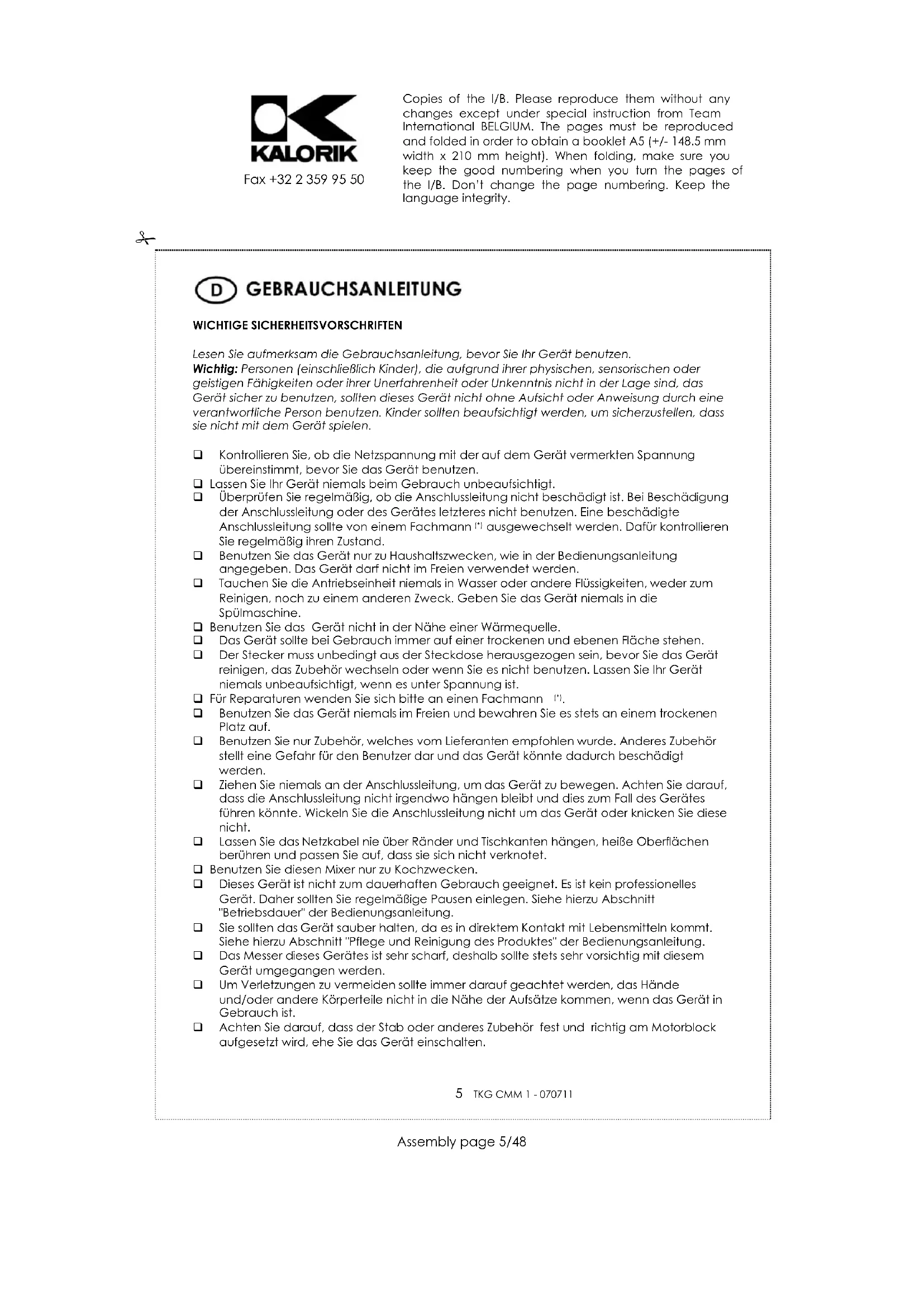 Benutzen Sie das Gerät niemals im Freien und bewahren Sie es stets an einem trockenen Platz auf. Benutzen Sie nur Zubehör, welches vom Lieferanten empfohlen wurde. Anderes Zubehör stellt eine Gefahr für den Benutzer dar und das Gerät könnte dadurch beschädigt werden. Ziehen Sie niemals an der Anschlussleitung, um das Gerät zu bewegen. Achten Sie darauf, dass die Anschlussleitung nicht irgendwo hängen bleibt und dies zum Fall des Gerätes führen könnte. Wickeln Sie die Anschlussleitung nicht um das Gerät oder knicken Sie diese nicht. Lassen Sie das Netzkabel nie über Ränder und Tischkanten hängen, heiße Oberflächen berühren und passen Sie auf, dass sie sich nicht verknotet. Benutzen Sie diesen Mixer nur zu Kochzwecken. Dieses Gerät ist nicht zum dauerhaften Gebrauch geeignet. Es ist kein professionelles Gerät. Daher sollten Sie regelmäßige Pausen einlegen. Siehe hierzu Abschnitt "Betriebsdauer" der Bedienungsanleitung. Sie sollten das Gerät sauber halten, da es in direktem Kontakt mit Lebensmitteln kommt. Siehe hierzu Abschnitt "Pflege und Reinigung des Produktes" der Bedienungsanleitung. Das Messer dieses Gerätes ist sehr scharf, deshalb sollte stets sehr vorsichtig mit diesem Gerät umgegangen werden. Um Verletzungen zu vermeiden sollte immer darauf geachtet werden, das Hände und/oder andere Körperteile nicht in die Nähe der Aufsätze kommen, wenn das Gerät in Gebrauch ist. Achten Sie darauf, dass der Stab oder anderes Zubehör fest und richtig am Motorblock aufgesetzt wird, ehe Sie das Gerät einschalten. Copies of the I/B. Please reproduce them without any changes except under special instruction from Team International BELGIUM. The pages must be reproduced and folded in order to obtain a booklet A5 (+/- 148.5 mm width x 210 mm height). When folding, make sure you keep the good numbering when you turn the pages of the I/B. Don’t change the page numbering. Keep the language integrity.