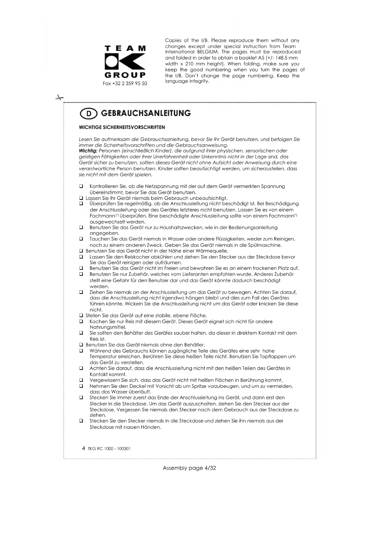 ausgewechselt werden. Benutzen Sie das Gerät nur zu Haushaltszwecken, wie in der Bedienungsanleitung angegeben. Tauchen Sie das Gerät niemals in Wasser oder andere Flüssigkeiten, weder zum Reinigen, noch zu einem anderen Zweck. Geben Sie das Gerät niemals in die Spülmaschine. Benutzen Sie das Gerät nicht in der Nähe einer Wärmequelle. Lassen Sie den Reiskocher abkühlen und ziehen Sie den Stecker aus der Steckdose bevor Sie das Gerät reinigen oder aufräumen. Benutzen Sie das Gerät nicht im Freien und bewahren Sie es an einem trockenen Platz auf. Benutzen Sie nur Zubehör, welches vom Lieferanten empfohlen wurde. Anderes Zubehör stellt eine Gefahr für den Benutzer dar und das Gerät könnte dadurch beschädigt werden. Ziehen Sie niemals an der Anschlussleitung um das Gerät zu bewegen. Achten Sie darauf, dass die Anschlussleitung nicht irgendwo hängen bleibt und dies zum Fall des Gerätes führen könnte. Wickeln Sie die Anschlussleitung nicht um das Gerät oder knicken Sie diese nicht. Stellen Sie das Gerät auf eine stabile, ebene Fläche. Kochen Sie nur Reis mit diesem Gerät. Dieses Gerät eignet sich nicht für andere Nahrungsmittel. Sie sollten den Behälter des Gerätes sauber halten, da dieser in direktem Kontakt mit dem Reis ist. Benutzen Sie das Gerät niemals ohne den Behälter. Während des Gebrauchs können zugängliche Teile des Gerätes eine sehr hohe Temperatur erreichen. Berühren Sie diese heißen Teile nicht. Benutzen Sie Topflappen um das Gerät zu verstellen. Achten Sie darauf, dass die Anschlussleitung nicht mit den heißen Teilen des Gerätes in Kontakt kommt. Vergewissern Sie sich, dass das Gerät nicht mit heißen Flächen in Berührung kommt. Nehmen Sie den Deckel mit Vorsicht ab um Spritze vorzubeugen, und um zu vermeiden, dass das Wasser überläuft. Stecken Sie immer zuerst das Ende der Anschlussleitung ins Gerät, und dann erst den Stecker in die Steckdose. Um das Gerät auszuschalten, ziehen Sie den Stecker aus der Steckdose. Vergessen Sie niemals den Stecker nach dem Gebrauch aus der Steckdose zu ziehen. Stecken Sie den Stecker niemals in die Steckdose und ziehen Sie ihn niemals aus der Steckdose mit nassen Händen. Copies of the I/B. Please reproduce them without any changes except under special instruction from Team International BELGIUM. The pages must be reproduced and folded in order to obtain a booklet A5 (+/- 148.5 mm width x 210 mm height). When folding, make sure you keep the good numbering when you turn the pages of the I/B. Don’t change the page numbering. Keep the language integrity.