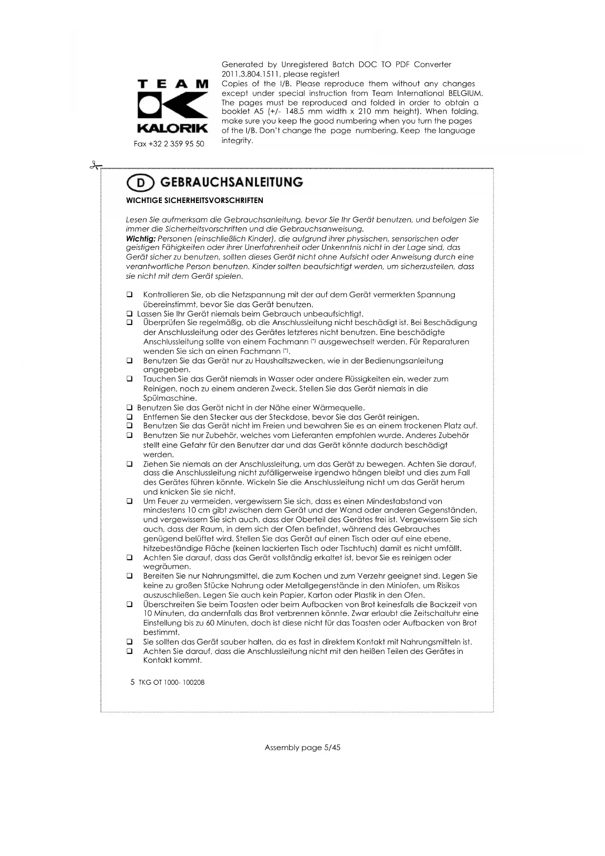 Zum Schutz unserer Umwelt und unserer Gesundheit sind Elektro- und Elektronik-Altgeräte nach bestimmten Regeln zu entsorgen. Dies fordert den Einsatz sowohl des Herstellers bzw. Lieferanten als auch des Verbrauchers. Aus diesem Grund darf dieses Gerät, wie das Symbol auf dem Typenschild bzw. auf der Verpackung zeigt, nicht in den unsortierten Restmüll gegeben werden. Der Verbraucher hat das Recht, dieses Gerät über kommunale Sammelstellen zu entsorgen; von dort aus wird die spezifische Behandlung, Verwertung bzw. das Recycling gem. den Erfordernissen der Richtlinie sichergestellt.Generated by Unregistered Batch DOC TO PDF Converter 2011.3.804.1511, please register! Copies of the I/B. Please reproduce them without any changes except under special instruction from Team International BELGIUM. The pages must be reproduced and folded in order to obtain a booklet A5 (+/- 148.5 mm width x 210 mm height). When folding, make sure you keep the good numbering when you turn the pages of the I/B. Don’t change the page numbering. Keep the language integrity.