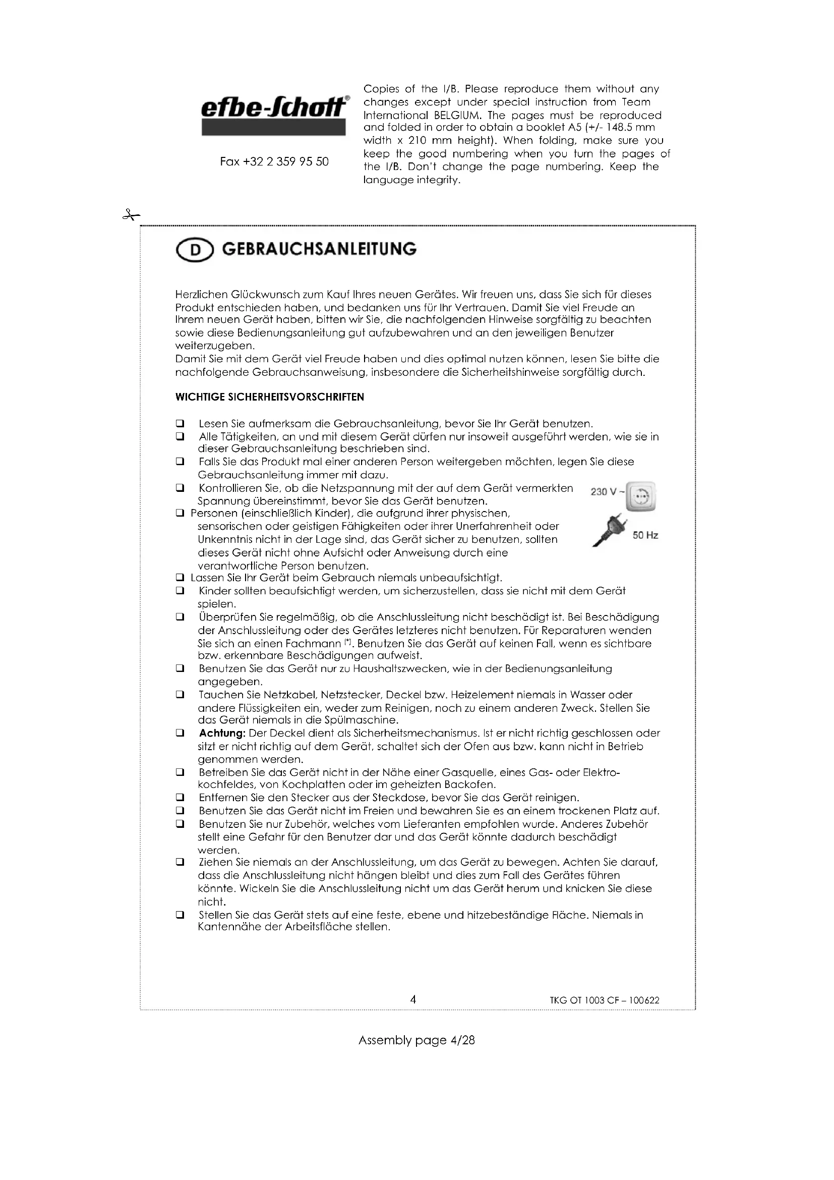 . Benutzen Sie das Gerät auf keinen Fall, wenn es sichtbare bzw. erkennbare Beschädigungen aufweist. Benutzen Sie das Gerät nur zu Haushaltszwecken, wie in der Bedienungsanleitung angegeben. Tauchen Sie Netzkabel, Netzstecker, Deckel bzw. Heizelement niemals in Wasser oder andere Flüssigkeiten ein, weder zum Reinigen, noch zu einem anderen Zweck. Stellen Sie das Gerät niemals in die Spülmaschine. Achtung: Der Deckel dient als Sicherheitsmechanismus. Ist er nicht richtig geschlossen oder sitzt er nicht richtig auf dem Gerät, schaltet sich der Ofen aus bzw. kann nicht in Betrieb genommen werden. Betreiben Sie das Gerät nicht in der Nähe einer Gasquelle, eines Gas- oder Elektro- kochfeldes, von Kochplatten oder im geheizten Backofen. Entfernen Sie den Stecker aus der Steckdose, bevor Sie das Gerät reinigen. Benutzen Sie das Gerät nicht im Freien und bewahren Sie es an einem trockenen Platz auf. Benutzen Sie nur Zubehör, welches vom Lieferanten empfohlen wurde. Anderes Zubehör stellt eine Gefahr für den Benutzer dar und das Gerät könnte dadurch beschädigt werden. Ziehen Sie niemals an der Anschlussleitung, um das Gerät zu bewegen. Achten Sie darauf, dass die Anschlussleitung nicht hängen bleibt und dies zum Fall des Gerätes führen könnte. Wickeln Sie die Anschlussleitung nicht um das Gerät herum und knicken Sie diese nicht. Stellen Sie das Gerät stets auf eine feste, ebene und hitzebeständige Fläche. Niemals in Kantennähe der Arbeitsfläche stellen. Copies of the I/B. Please reproduce them without any changes except under special instruction from Team International BELGIUM. The pages must be reproduced and folded in order to obtain a booklet A5 (+/- 148.5 mm width x 210 mm height). When folding, make sure you keep the good numbering when you turn the pages of the I/B. Don’t change the page numbering. Keep the language integrity.