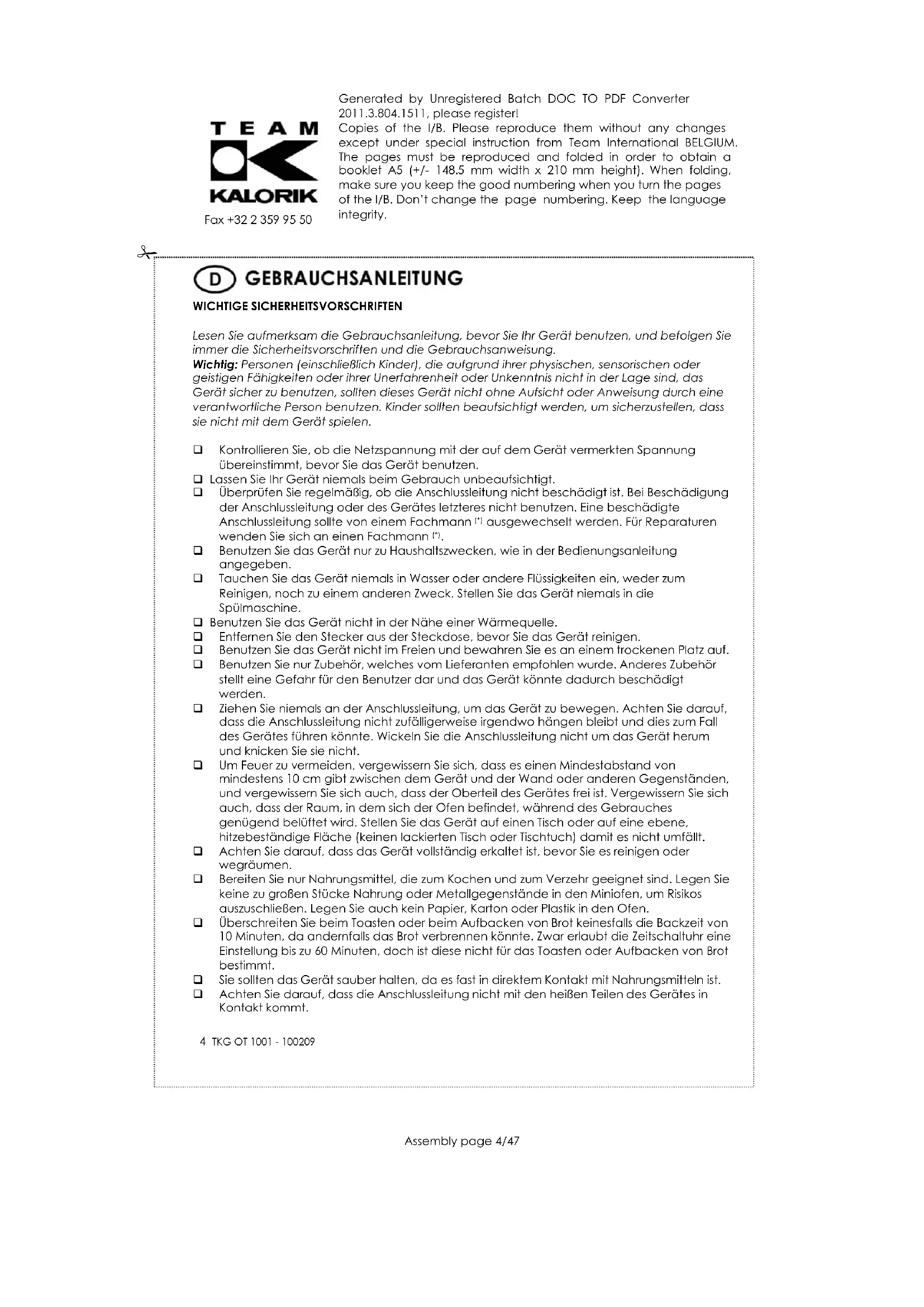 Benutzen Sie das Gerät nur zu Haushaltszwecken, wie in der Bedienungsanleitung angegeben. Tauchen Sie das Gerät niemals in Wasser oder andere Flüssigkeiten ein, weder zum Reinigen, noch zu einem anderen Zweck. Stellen Sie das Gerät niemals in die Spülmaschine. Benutzen Sie das Gerät nicht in der Nähe einer Wärmequelle. Entfernen Sie den Stecker aus der Steckdose, bevor Sie das Gerät reinigen. Benutzen Sie das Gerät nicht im Freien und bewahren Sie es an einem trockenen Platz auf. Benutzen Sie nur Zubehör, welches vom Lieferanten empfohlen wurde. Anderes Zubehör stellt eine Gefahr für den Benutzer dar und das Gerät könnte dadurch beschädigt werden. Ziehen Sie niemals an der Anschlussleitung, um das Gerät zu bewegen. Achten Sie darauf, dass die Anschlussleitung nicht zufälligerweise irgendwo hängen bleibt und dies zum Fall des Gerätes führen könnte. Wickeln Sie die Anschlussleitung nicht um das Gerät herum und knicken Sie sie nicht. Um Feuer zu vermeiden, vergewissern Sie sich, dass es einen Mindestabstand von mindestens 10 cm gibt zwischen dem Gerät und der Wand oder anderen Gegenständen, und vergewissern Sie sich auch, dass der Oberteil des Gerätes frei ist. Vergewissern Sie sich auch, dass der Raum, in dem sich der Ofen befindet, während des Gebrauches genügend belüftet wird. Stellen Sie das Gerät auf einen Tisch oder auf eine ebene, hitzebeständige Fläche (keinen lackierten Tisch oder Tischtuch) damit es nicht umfällt. Achten Sie darauf, dass das Gerät vollständig erkaltet ist, bevor Sie es reinigen oder wegräumen. Bereiten Sie nur Nahrungsmittel, die zum Kochen und zum Verzehr geeignet sind. Legen Sie keine zu großen Stücke Nahrung oder Metallgegenstände in den Miniofen, um Risikos auszuschließen. Legen Sie auch kein Papier, Karton oder Plastik in den Ofen. Überschreiten Sie beim Toasten oder beim Aufbacken von Brot keinesfalls die Backzeit von 10 Minuten, da andernfalls das Brot verbrennen könnte. Zwar erlaubt die Zeitschaltuhr eine Einstellung bis zu 60 Minuten, doch ist diese nicht für das Toasten oder Aufbacken von Brot bestimmt. Sie sollten das Gerät sauber halten, da es fast in direktem Kontakt mit Nahrungsmitteln ist. Achten Sie darauf, dass die Anschlussleitung nicht mit den heißen Teilen des Gerätes in Kontakt kommt.Generated by Unregistered Batch DOC TO PDF Converter 2011.3.804.1511, please register! Copies of the I/B. Please reproduce them without any changes except under special instruction from Team International BELGIUM. The pages must be reproduced and folded in order to obtain a booklet A5 (+/- 148.5 mm width x 210 mm height). When folding, make sure you keep the good numbering when you turn the pages of the I/B. Don’t change the page numbering. Keep the language integrity.