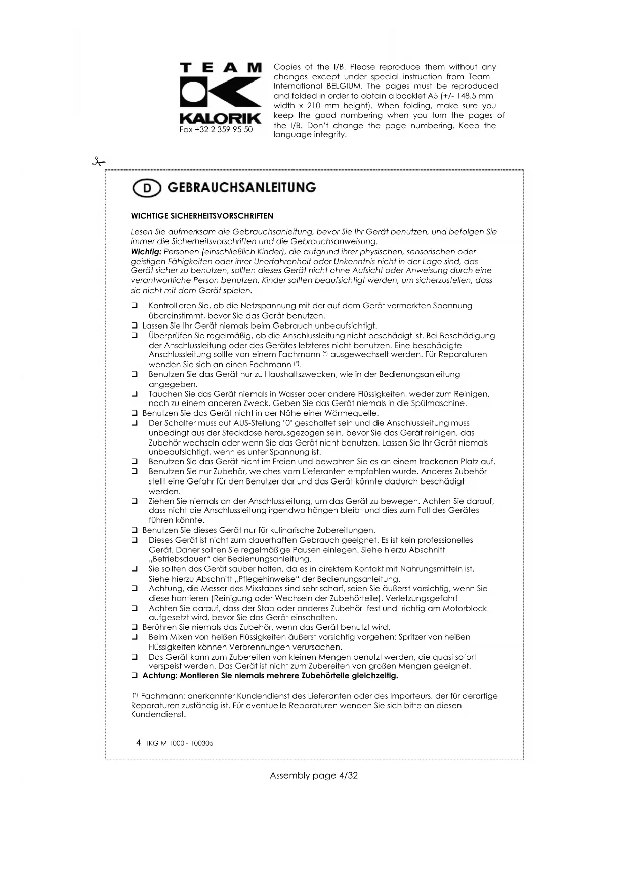Zum Schutz unserer Umwelt und unserer Gesundheit sind Elektro- und Elektronik-Altgeräte nach bestimmten Regeln zu entsorgen. Dies fordert den Einsatz sowohl des Herstellers bzw. Lieferanten als auch des Verbrauchers. Aus diesem Grund darf dieses Gerät, wie das Symbol auf dem Typenschild bzw. auf der Verpackung zeigt, nicht in den unsortierten Restmüll gegeben werden. Der Verbraucher hat das Recht, dieses Gerät über kommunale Sammelstellen zu entsorgen; von dort aus wird die spezifische Behandlung, Verwertung bzw. das Recycling gem. den Erfordernissen der Richtlinie sichergestellt. Copies of the I/B. Please reproduce them without any changes except under special instruction from Team International BELGIUM. The pages must be reproduced and folded in order to obtain a booklet A5 (+/- 148.5 mm width x 210 mm height). When folding, make sure you keep the good numbering when you turn the pages of the I/B. Don’t change the page numbering. Keep the language integrity.