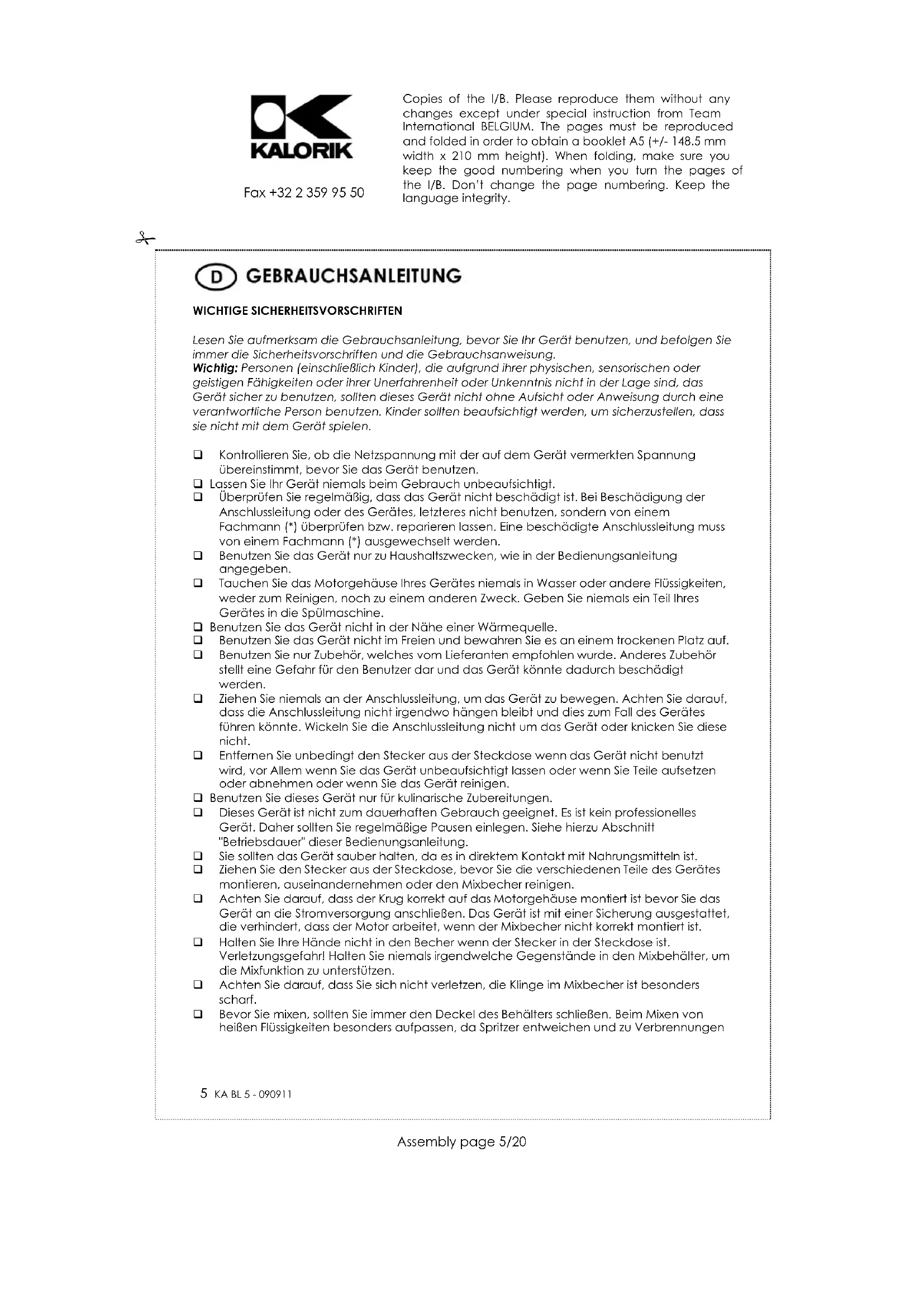 Zum Schutz unserer Umwelt und unserer Gesundheit sind Elektro- und Elektronik-Altgeräte nach bestimmten Regeln zu entsorgen. Dies fordert den Einsatz sowohl des Herstellers bzw. Lieferanten als auch des Verbrauchers. Aus diesem Grund darf dieses Gerät, wie das Symbol auf dem Typenschild bzw. auf der Verpackung zeigt, nicht in den unsortierten Restmüll gegeben werden. Der Verbraucher hat das Recht, dieses Gerät über kommunale Sammelstellen zu entsorgen; von dort aus wird die spezifische Behandlung, Verwertung bzw. das Recycling gem. den Erfordernissen der Richtlinie sichergestellt. Copies of the I/B. Please reproduce them without any changes except under special instruction from Team International BELGIUM. The pages must be reproduced and folded in order to obtain a booklet A5 (+/- 148.5 mm width x 210 mm height). When folding, make sure you keep the good numbering when you turn the pages of the I/B. Don’t change the page numbering. Keep the language integrity. 8 KA BL 5 - 090911