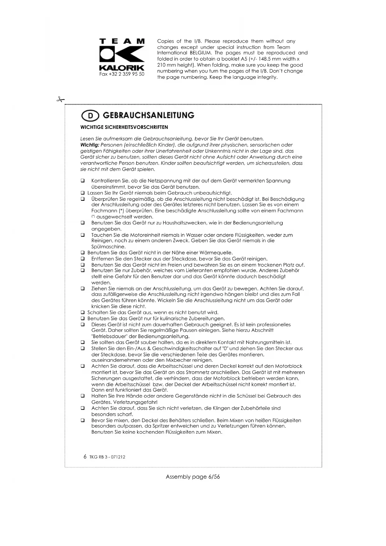 Zum Schutz unserer Umwelt und unserer Gesundheit sind Elektro- und Elektronik-Altgeräte nach bestimmten Regeln zu entsorgen. Dies fordert den Einsatz sowohl des Herstellers bzw. Lieferanten als auch des Verbrauchers. Aus diesem Grund darf dieses Gerät, wie das Symbol auf dem Typenschild bzw. auf der Verpackung zeigt, nicht in den unsortierten Restmüll gegeben werden. Der Verbraucher hat das Recht, dieses Gerät über kommunale Sammelstellen zu entsorgen; von dort aus wird die spezifische Behandlung, Verwertung bzw. das Recycling gem. den Erfordernissen der Richtlinie sichergestellt. Copies of the I/B. Please reproduce them without any changes except under special instruction from Team International BELGIUM. The pages must be reproduced and folded in order to obtain a booklet A5 (+/- 148.5 mm width x 210 mm height). When folding, make sure you keep the good numbering when you turn the pages of the I/B. Don’t change the page numbering. Keep the language integrity.