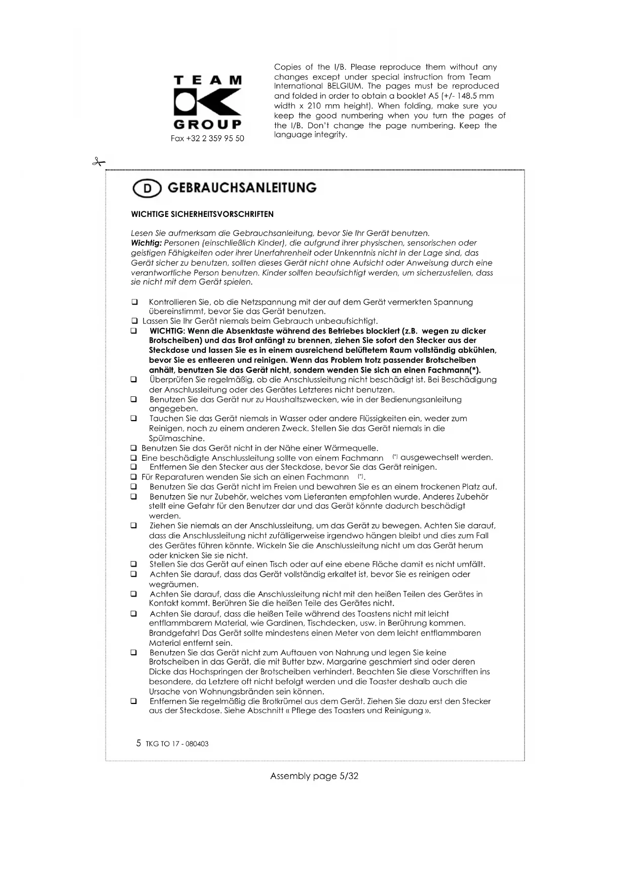 Benutzen Sie das Gerät nicht im Freien und bewahren Sie es an einem trockenen Platz auf. Benutzen Sie nur Zubehör, welches vom Lieferanten empfohlen wurde. Anderes Zubehör stellt eine Gefahr für den Benutzer dar und das Gerät könnte dadurch beschädigt werden. Ziehen Sie niemals an der Anschlussleitung, um das Gerät zu bewegen. Achten Sie darauf, dass die Anschlussleitung nicht zufälligerweise irgendwo hängen bleibt und dies zum Fall des Gerätes führen könnte. Wickeln Sie die Anschlussleitung nicht um das Gerät herum oder knicken Sie sie nicht. Stellen Sie das Gerät auf einen Tisch oder auf eine ebene Fläche damit es nicht umfällt. Achten Sie darauf, dass das Gerät vollständig erkaltet ist, bevor Sie es reinigen oder wegräumen. Achten Sie darauf, dass die Anschlussleitung nicht mit den heißen Teilen des Gerätes in Kontakt kommt. Berühren Sie die heißen Teile des Gerätes nicht. Achten Sie darauf, dass die heißen Teile während des Toastens nicht mit leicht entflammbarem Material, wie Gardinen, Tischdecken, usw. in Berührung kommen. Brandgefahr! Das Gerät sollte mindestens einen Meter von dem leicht entflammbaren Material entfernt sein. Benutzen Sie das Gerät nicht zum Auftauen von Nahrung und legen Sie keine Brotscheiben in das Gerät, die mit Butter bzw. Margarine geschmiert sind oder deren Dicke das Hochspringen der Brotscheiben verhindert. Beachten Sie diese Vorschriften ins besondere, da Letztere oft nicht befolgt werden und die Toaster deshalb auch die Ursache von Wohnungsbränden sein können. Entfernen Sie regelmäßig die Brotkrümel aus dem Gerät. Ziehen Sie dazu erst den Stecker aus der Steckdose. Siehe Abschnitt « Pflege des Toasters und Reinigung ». Copies of the I/B. Please reproduce them without any changes except under special instruction from Team International BELGIUM. The pages must be reproduced and folded in order to obtain a booklet A5 (+/- 148.5 mm width x 210 mm height). When folding, make sure you keep the good numbering when you turn the pages of the I/B. Don’t change the page numbering. Keep the language integrity.